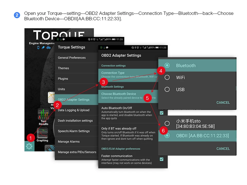 Сначала убедитесь, что сканер подключен к вашему автомобилю и включен. И включите функцию Bluetooth на вашем телефоне, чтобы найти и подключить устройство «OBDII» как шаги по фото.