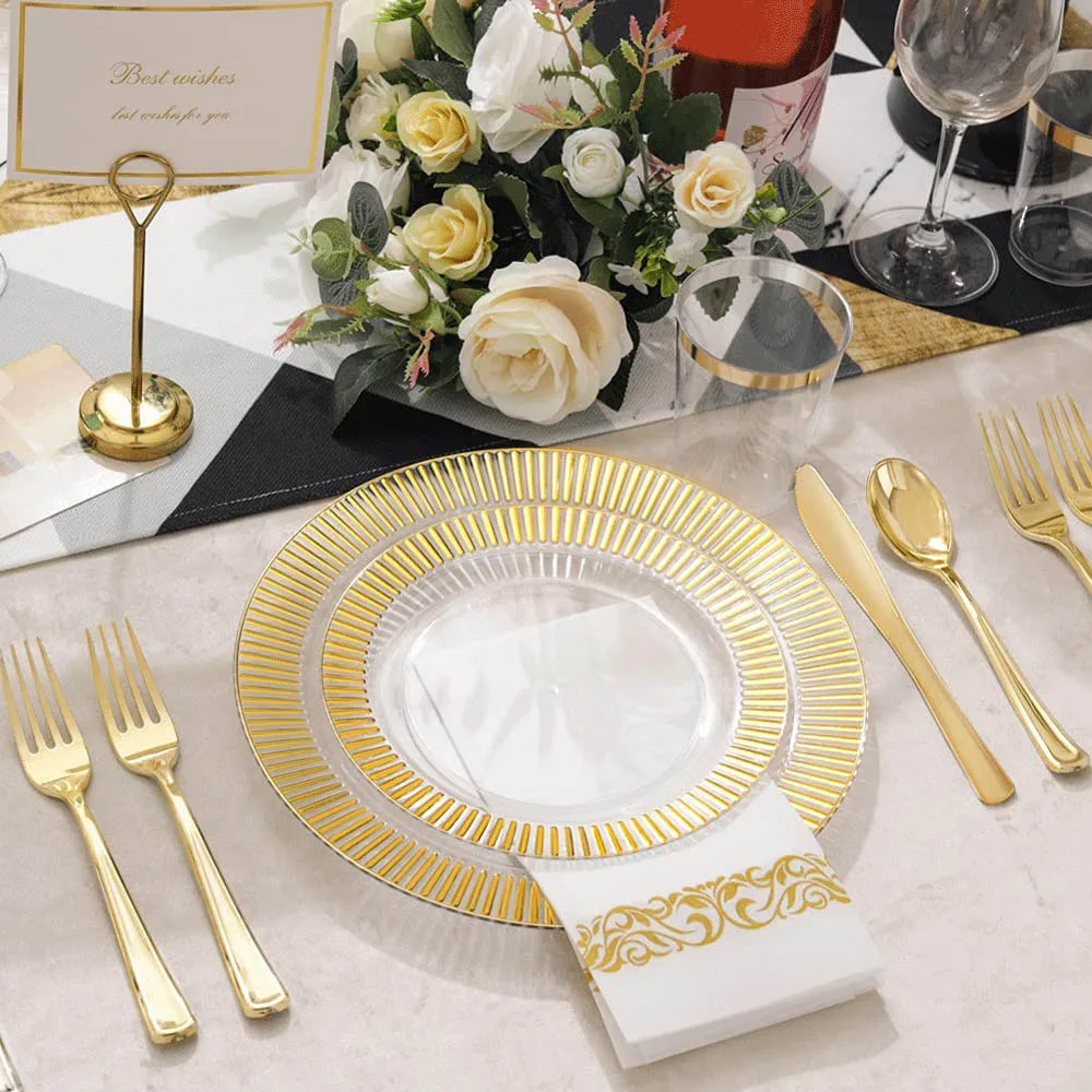 [Обслуживание 10 гостей] этот набор золотой посуды содержит все необходимое для обслуживания 10 гостей. В том числе: 10 обеденных тарелок, 10 салатных тарелок, 10 вилок, 10 ножей, 10 ложек, 10 пластиковых стаканчиков, 25 салфеток. Наша посуда может удовлетворить основные потребности развлекательных гостей без необходимости покупать другие продукты.