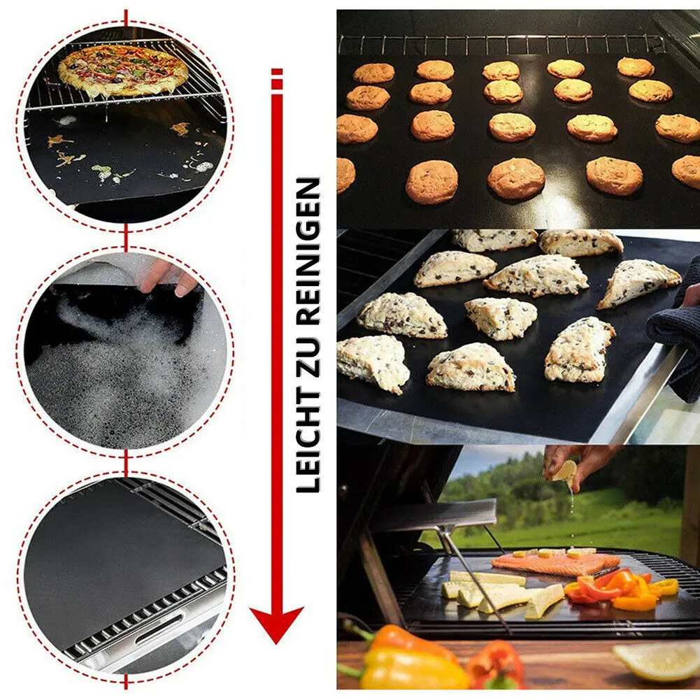 Особенности: * Новое антипригарное покрытие, барбекю Гриль коврик для гриля и микроволновой печи * Коврик для барбекю подходит для непрямой приготовления на газовых, угольных и электрических грилях * Поместите коврик на поверхность гриля и положите еду прямо на коврик * Очень подходит для овощей, бекона, рыбы, мяса на гриле и т. д. * Коврик для барбекю делает гриль легким * Предотвращает попадание пищи через трещины! * Антипригарный и многоразовый * Анти-прилипание * Консервант * Нетоксичный * Высокая термостойкость до 260 градусов Цельсия * Легко удаляет пятна на поверхности масла * Цвет: черный * Материал: высококачественное покрытие из стекловолокна PTFE * Размер: около 40*50 см Применение 1. Нагревание пищи: А. Используйте ножницы, чтобы разрезать коврик для барбекю в желаемый размер и форму B. Поместите коврик в кастрюлю, тарелку или другой контейнер C. Положите еду на ковер D. Снимите ковер после мытья пищи и охлаждения ковра. Очистите ковер стиральной водой. Е. Коврик для барбекю можно использовать повторно. 2. Может использоваться в качестве прокладки печи: А. Электрическая духовка: Поместите коврик на дно духовки или на полку внизу B. Паровая Печь: Поместите коврик на самую низкую полку, а не непосредственно на нижнюю часть духовки. C. Как поверхность предварительной обработки, коврик может использоваться в качестве верстака для обработки теста, с антипригарными свойствами. Посылка: 5x коврик для барбекю