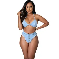 Джинсовый топ, Женский комплект бикини 2021, женский купальник, комплект бикини, укороченный топ и шорты, сексуальный пляжный купальник, джинсовый комплект из 2 предметов, наряды