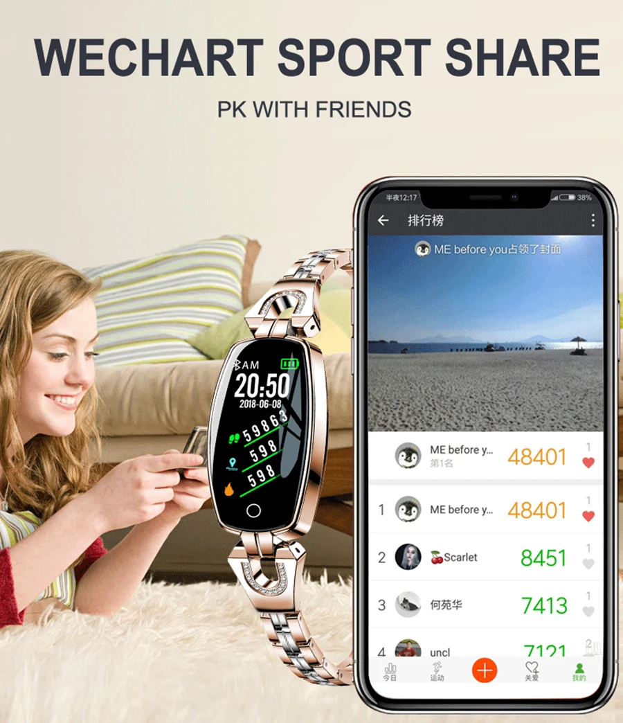 Основная функция: * Трекер здоровья: монитор сердечного ритма, измерение артериального давления, шагомер, счетчик калорий, движение расстояния, монитор сна, оповещение о малоподвижности. * Спортивный режим: бег, плавание, езда, альпинизм, баскетбол, футбол, прогулки, batminton и многое другое. * Push-уведомления: звонки, SMS, текстовые оповещения, Facebook, twitter и whatsapp Push. * Практические функции: оповещение о тревоге, часы времени, защита от потери, Поиск телефона. * Пульт дистанционного управления: пульт дистанционного управления (пожимает руки, чтобы запечатлеть фотографии). * Водонепроницаемость IP67: это означает, что вам не нужно снимать браслет, когда вы моете руки, ходите под дождем. Обратите внимание: часы не поддерживают плавание, Дайвинг * Поддержка языков: английский, французский, немецкий, итальянский, японский, корейский, португальский, русский, испанский. Характеристики: Набор микросхем: NRF52832. Чип PPG: ч 3300. Размер экрана: 0,96 дюймов TFT HD цветной экран Размер ремешка: 120-200 мм Цвет: розовое золото, серебро, черный Разрешение экрана: 80x160 Bluetooth: 4,0 (низкое энергопотребление) Водонепроницаемый индекс: IP67 Материал корпуса и ремешка: цинковый сплав Емкость аккумулятора: 90 мАч Тип зарядки: USB зарядка Время зарядки: около 2 часов Нормальное время использования: 3-5 дней Время работы в режиме ожидания: 7 дней Совместимая система: для Android 4,4 и выше, для IOS 8,0 и выше Название приложения: WearHealth, есть qr-код в руководстве пользователя, пожалуйста, отсканируйте код и загрузите приложение, или, пожалуйста, найдите «WearHealth» в APP store. Посылка включает: 1 * умные часы 1 * Зарядное устройство USB 1 * Инструмент для ремня 1 * Руководство пользователя 1 * Розничная коробка