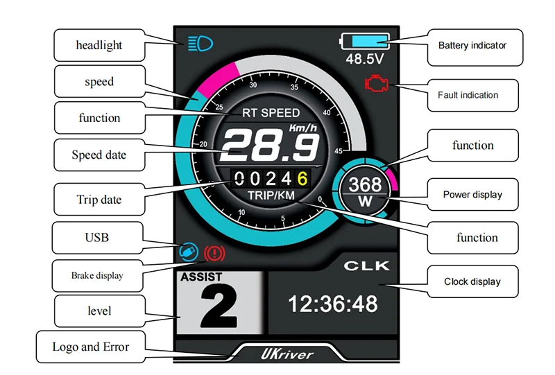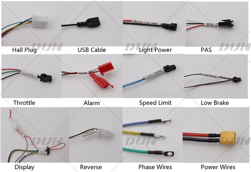 Функции: зал, дроссельная заслонка, светильник, PAS, дроссельная заслонка, сигнализация, ограничение скорости, низкий тормоз, три скорости, дисплей, реверс, фазовые провода, провода питания.