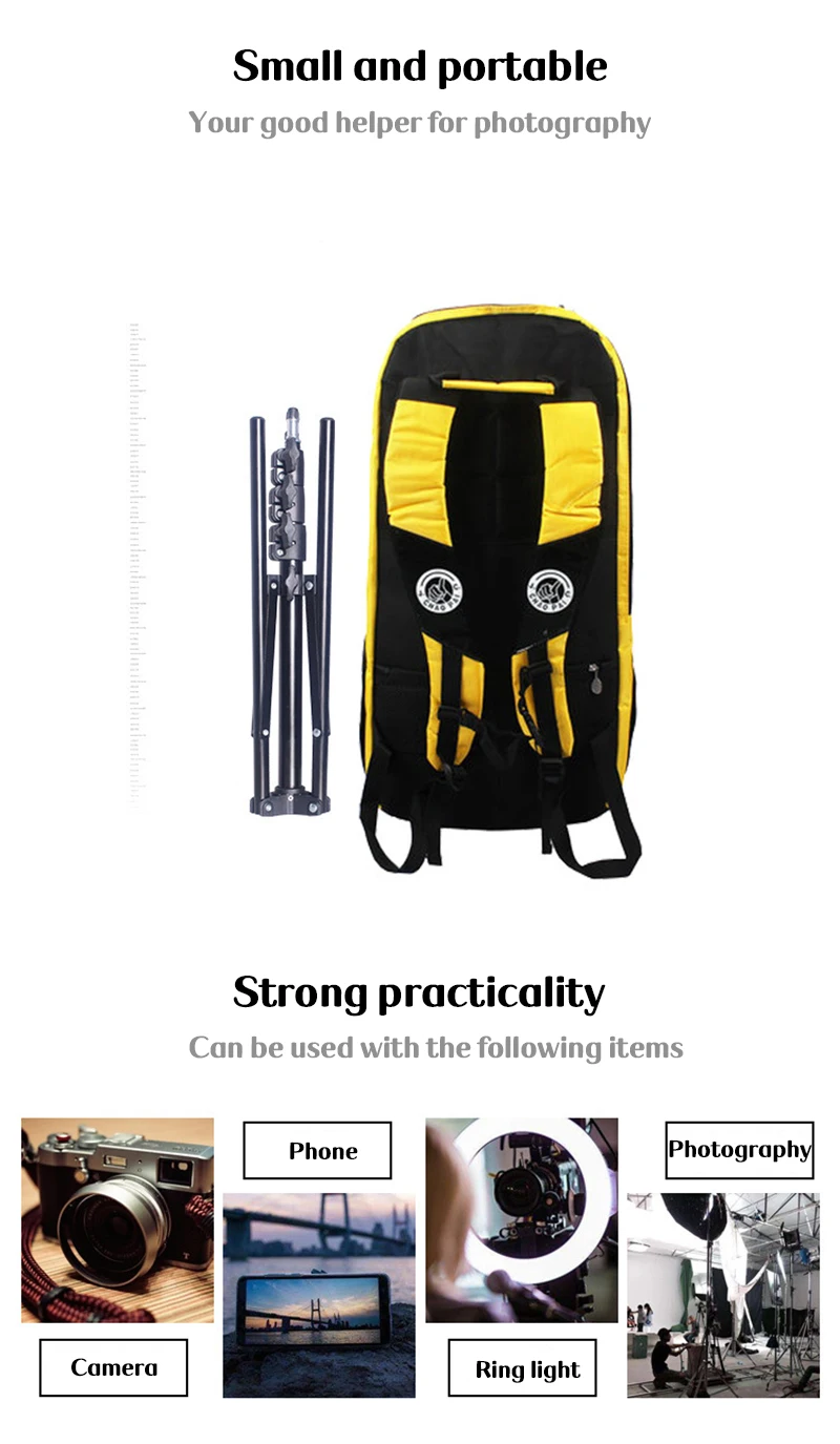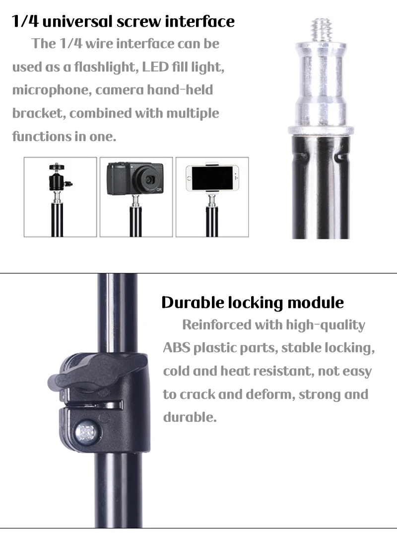 Описание: Название продукта: Штатив для фотосъемки Диаметр трубы: 16/19/22/25 мм Материал изделия: алюминий Винт: 1/4 Максимальная высота: 160 см Толщина стенки: 0,4 мм/0,3 мм Высота складывания: 40 см Область применения: мобильные телефоны, цифровые камеры, кольцевые огни, фотографическое оборудование Особенности: 1. 1/4 Универсальный винтовой интерфейс, может быть подключен к вспышке, светодиодный светильник, микрофон, Кронштейн ручной камеры, в сочетании с несколькими функциями в одном. 2. Прочный модуль блокировки, усиленный высококачественными ABS пластиковыми деталями, стабильная блокировка, холодная и термостойкая, не легко трескается и деформируется, прочная и долговечная. 3. Треугольная конструкция, нижняя треугольная конструкция более устойчива и прочна. 4. Высококачественная трубка для ног, внутренняя стенка нижней части стопы утолщена, поддерживающая сила больше и стабильнее Посылка содержит: 1 штатив Примечание: Пожалуйста, допускайте погрешность 1-5 мм для всех размеров, спасибо за понимание Из-за различных световых эффектов фактический цвет проекта может немного отличаться от цвета, показанного на картинке.