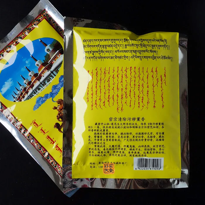 Тибетский благовоний порошок является общим продуктом буддизма. После фумигации, блага и травы, хранящиеся в порошке фумигации, не только переполняются ароматом, но и в сочетании с поговоркой и песнопением Священного Писания-это очень осмысленная практика, которая может устранить злом, увеличьте удачу и накапливайте силу.