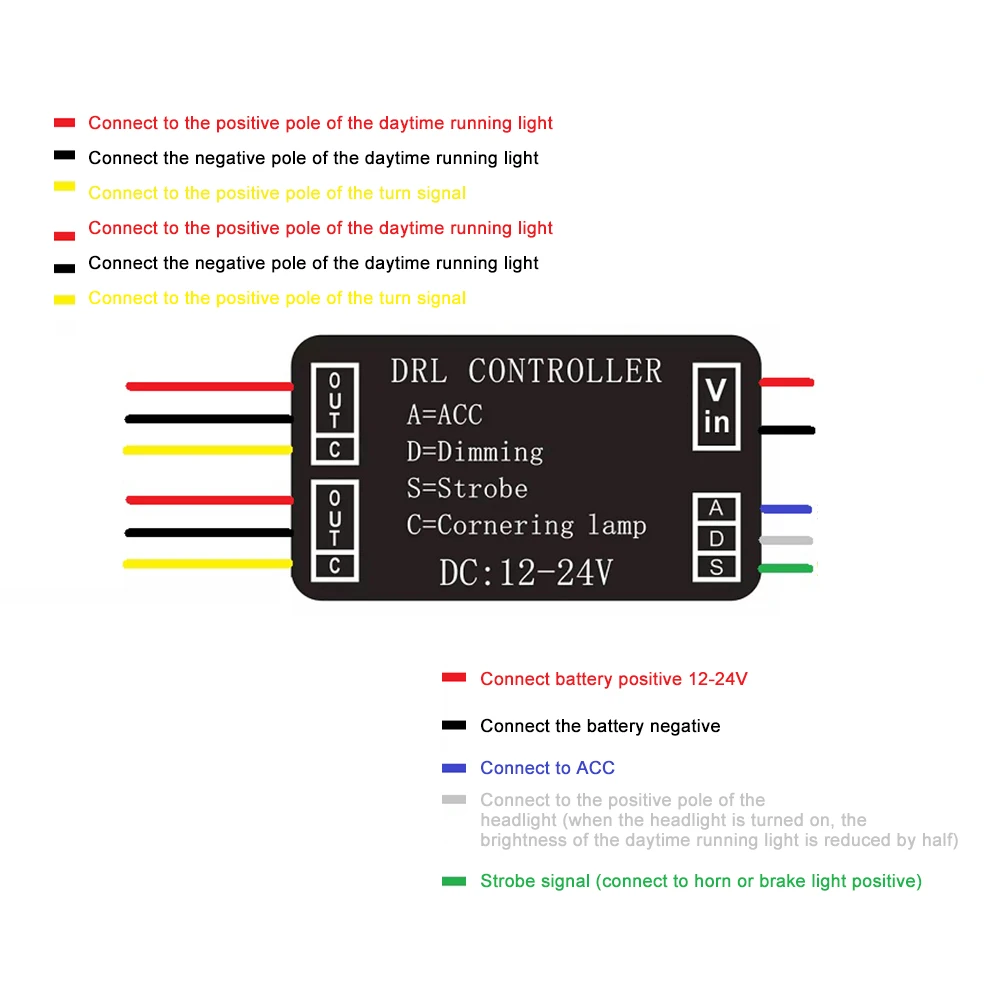 * 2. Красный и черный выход подключения +/-полюса DRL