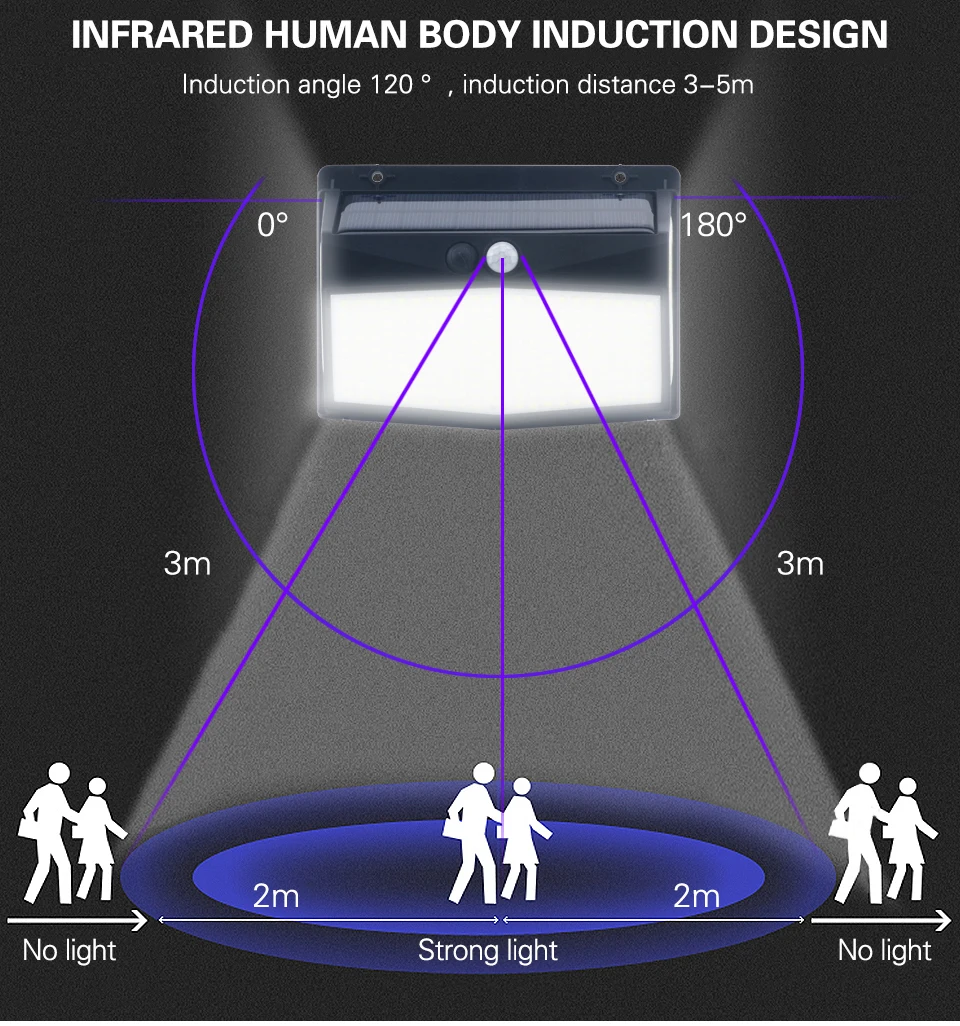 2. Датчик движения PIR: чувствительный светильник датчика PIR может обнаруживать движение людей от 3 до 5 м. Светильник будет автоматически включаться и выключаться.