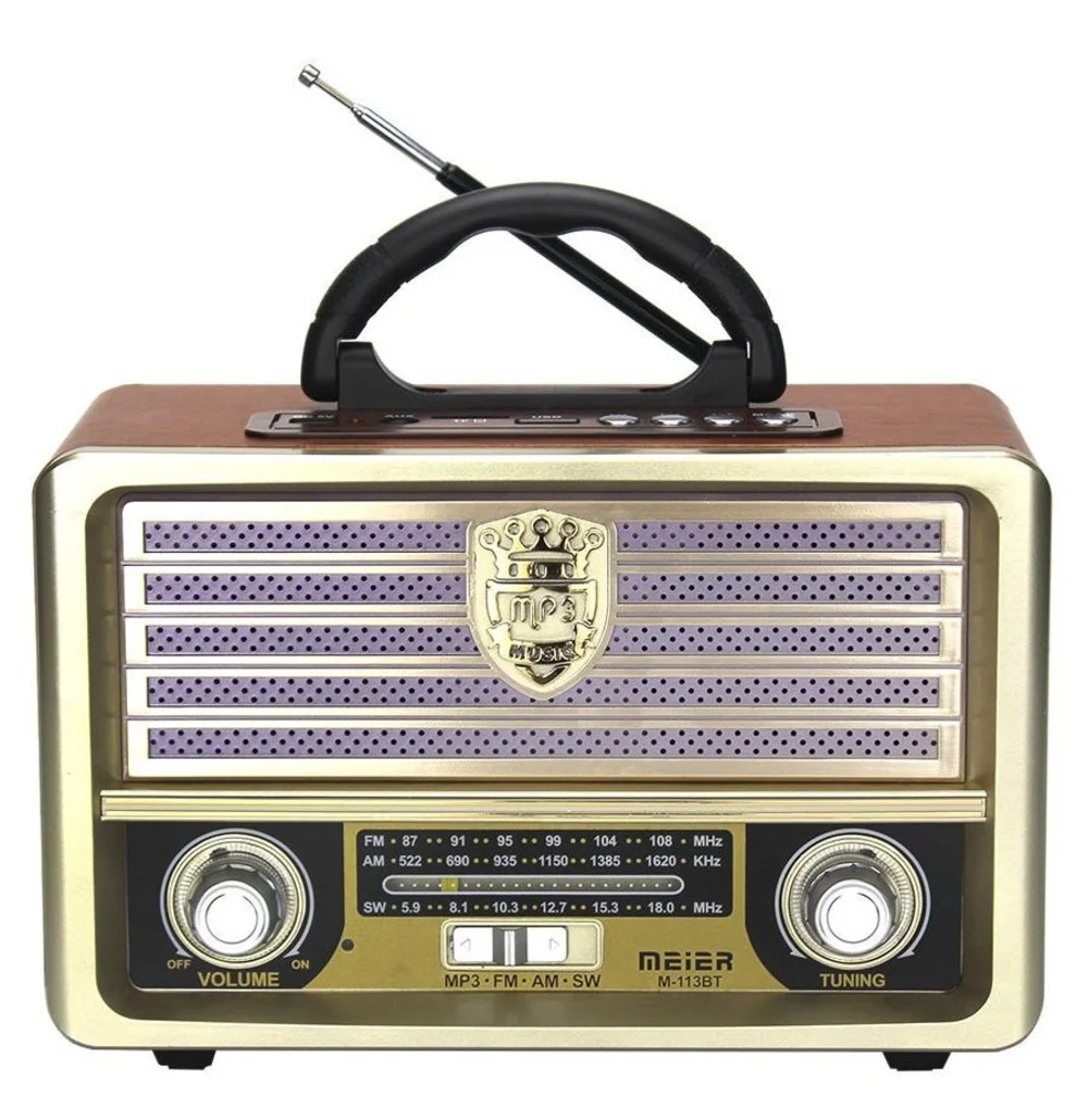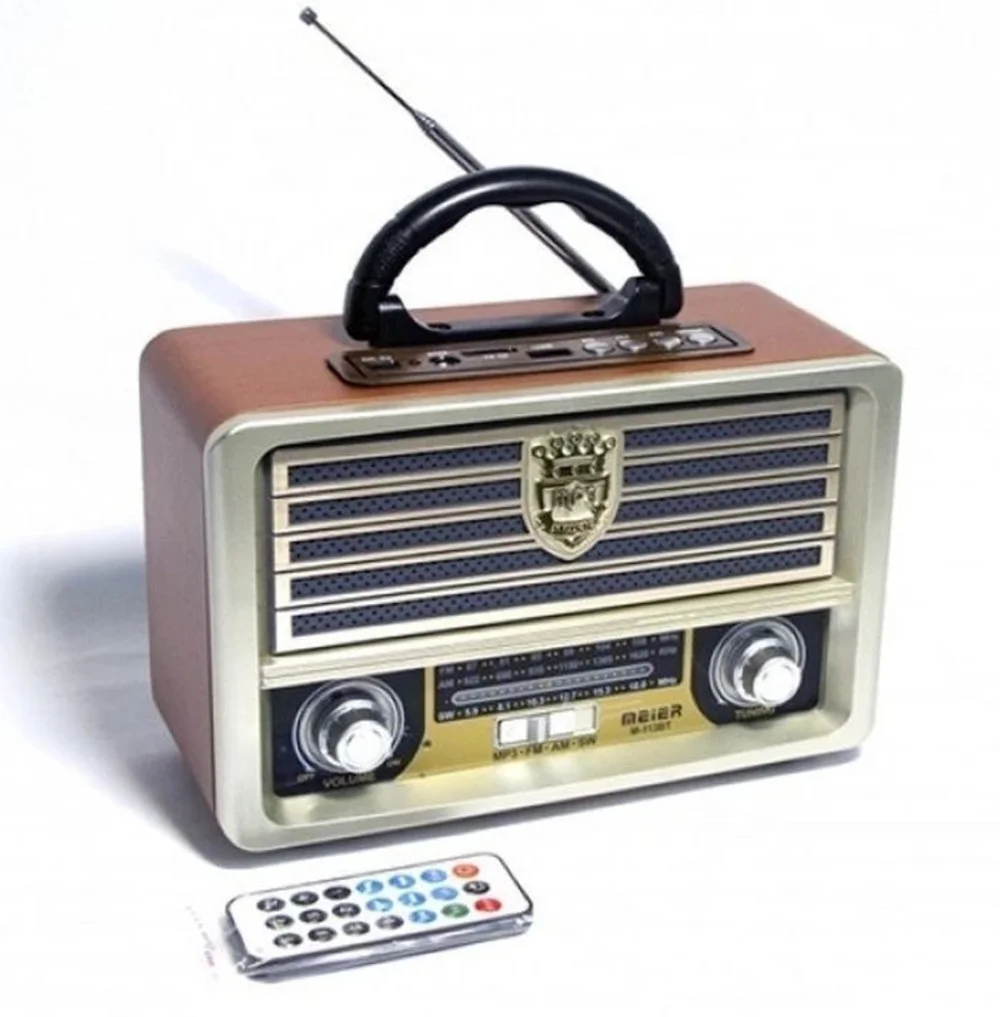 Всеволновой радиоприемник Meier M-113BT с поддержкой воспроизведения файлов с флешки или карты памяти, а также в беспроводном режиме по Bluetooth. Благодаря универсальному питанию приемник может использоваться как стационарный, так переносной. Радиоприемник Meier M-113BT выполненный в ретро-дизайне идеально подходит для туристов, рыбаков, путешественников, любителей отдыха на природе. Характеристики: Воспроизведение по Bluetooth Диапазон тюнера: AM/FM/SW Телескопическая антенна Пульт ДУ Поддержка USB / SD / МР3 / TF карт для прослушивания музыки Аналоговая регулировка громкости и радиоволн Встроенный перезаряжаемый аккумулятор Встроенный мощный динамик с хорошим звучанием Разъём для питания от сети AUX гнездо AC: 110-220V /60-50HZ DC: 5V Батарейки: типа «D», (батарейки в комплект не входят), 2 шт.