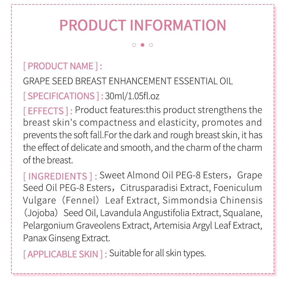 Удовлетворение потребностей: эфирное масло виноградных косточек может активировать Материнские клетки, дополнять питание, затягивать и восстанавливать. Содержит безопасные и питательные растительные экстракты, которые помогут вам улучшить состояние груди.