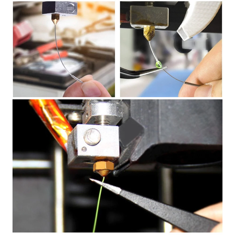 Игла для очистки сопла очень гибкая, прочная, легко сгибать иглу в сопло, не ломаясь. Это очень подходит для работы с твердым засорением сопла на горячем конце экструдера.