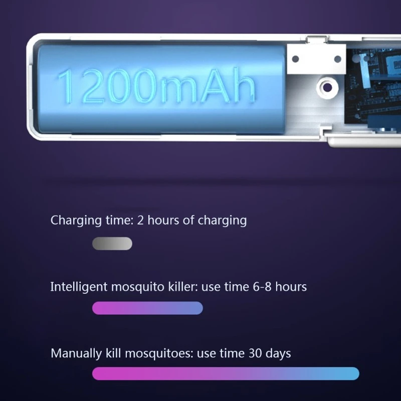 Встроенный литиевый аккумулятор 1200 мАч, после полной зарядки, ручной режим уничтожения насекомых используется для 30 дней только один раз в месяц.