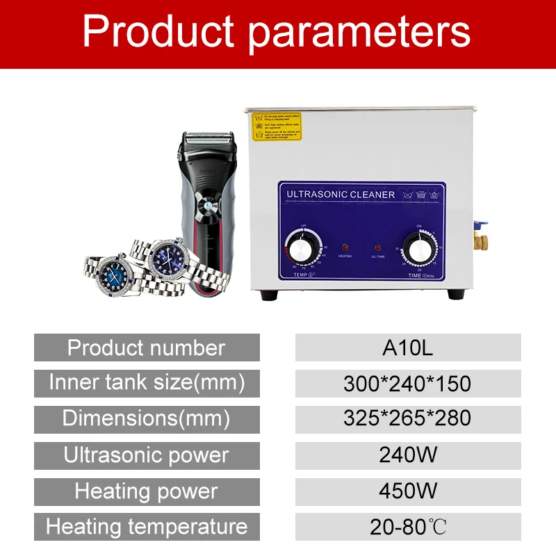 • Применимые чистящие предметы: электронные продукты, лабораторные принадлежности, офисные принадлежности, бытовые принадлежности, материнские платы и компьютерные аксессуары, стеклянная посуда, печатные платы, автозапчасти, комплектующие, медицинское оборудование, зубные протезы и стоматологическое оборудование, очки, ожерелья, серьги, браслеты, часы, чернильные головки принтера (Не требуется специальная очищающая жидкость, просто нажмите на воду), бритвенные головки, наконечники, монеты, значки, пустышки, чашки, мыть фрукты, овощи и т. д.