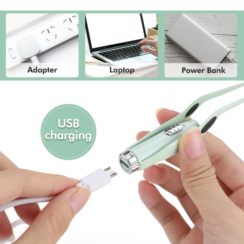 Power supply: USB charging(ear pick and ear tweezers), button batteries(nose tweezers)