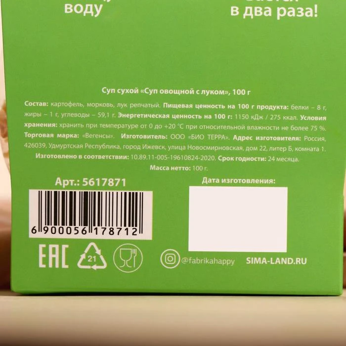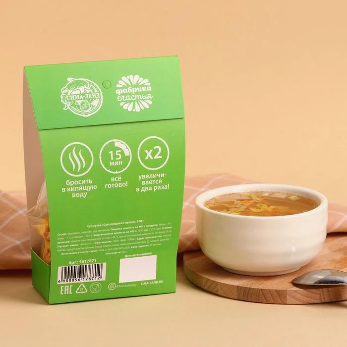 Возраст (словесный) Взрослый Цвет Зелёный Товар 18+ (да/нет) Нет Вид продуктов быстрого приготовления Суп Вес нетто, г 100 Тематика праздника Универсальная Эксклюзивный дизайн (да/нет) для НР Да