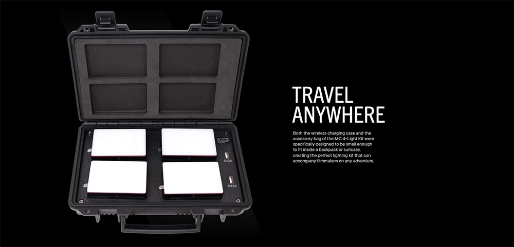 The Aputure MC 4-Light Travel Kit is designed for guerilla and travel filmmakers. Bundling the convenience of wireless charging with a durable hardshell case, that’s slim enough to fit in a camera bag or backpack, allows you to always be ready for any situation, while on the move.