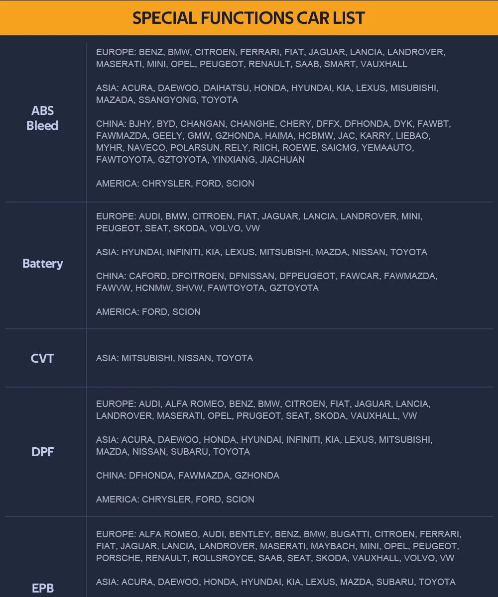 (2) 13 специальных функций (сервис сброса масла, сервис EPB, ABS кровотечение, BMS сервис, TPMS сервис, DPF сервис, IMMO сервис, SAS рулевой угловой датчик, инжекторное кодирование, TPS адаптация дроссельной заслонки, CVT, GEAR LEARN, ODO-METER)
