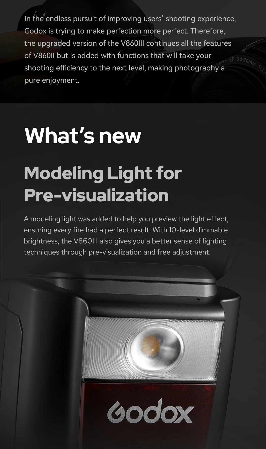 V860III-S Godox добавили свет моделирования спереди, чтобы помочь предварительной визуализации, и сочетаются с окружающим светом, с яркостью затемнения в 10 уровней; недавно добавленная Быстрая кнопка сбоку для быстрого переключения из ручного режима в режим TTL; Обновил быстросъемный замок до быстрого рычага для блокировки вспышки на горячий башмак камеры.