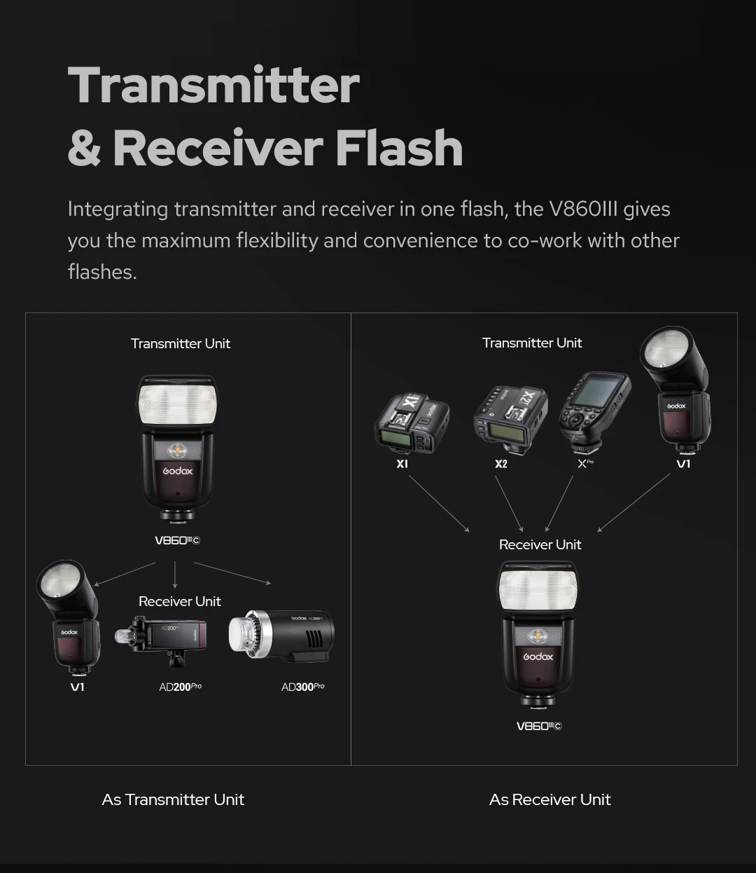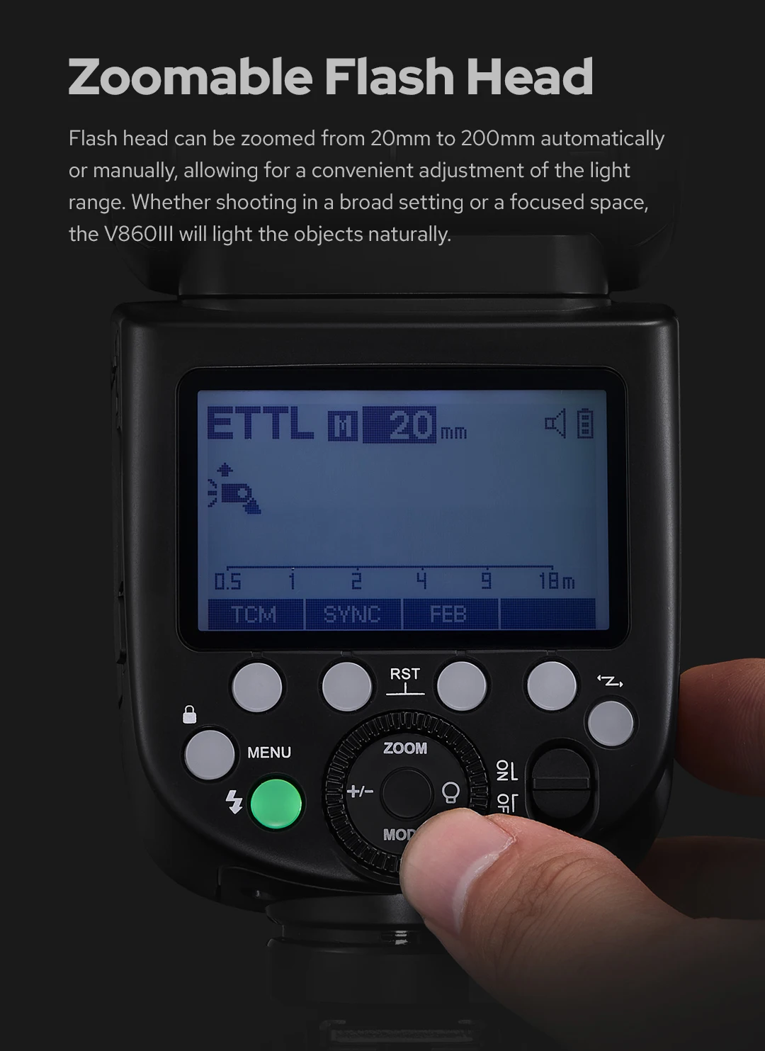 V860IIIS Встроенная беспроводная система Godox 2,4G X предлагает все-в-одном функции, GN60 высокое направляющее число, и 20-200 Zoom покрытие вспышки, до 100 метров дальность передачи. Оптическая передача с равномерным освещением и стабильным выходом.
