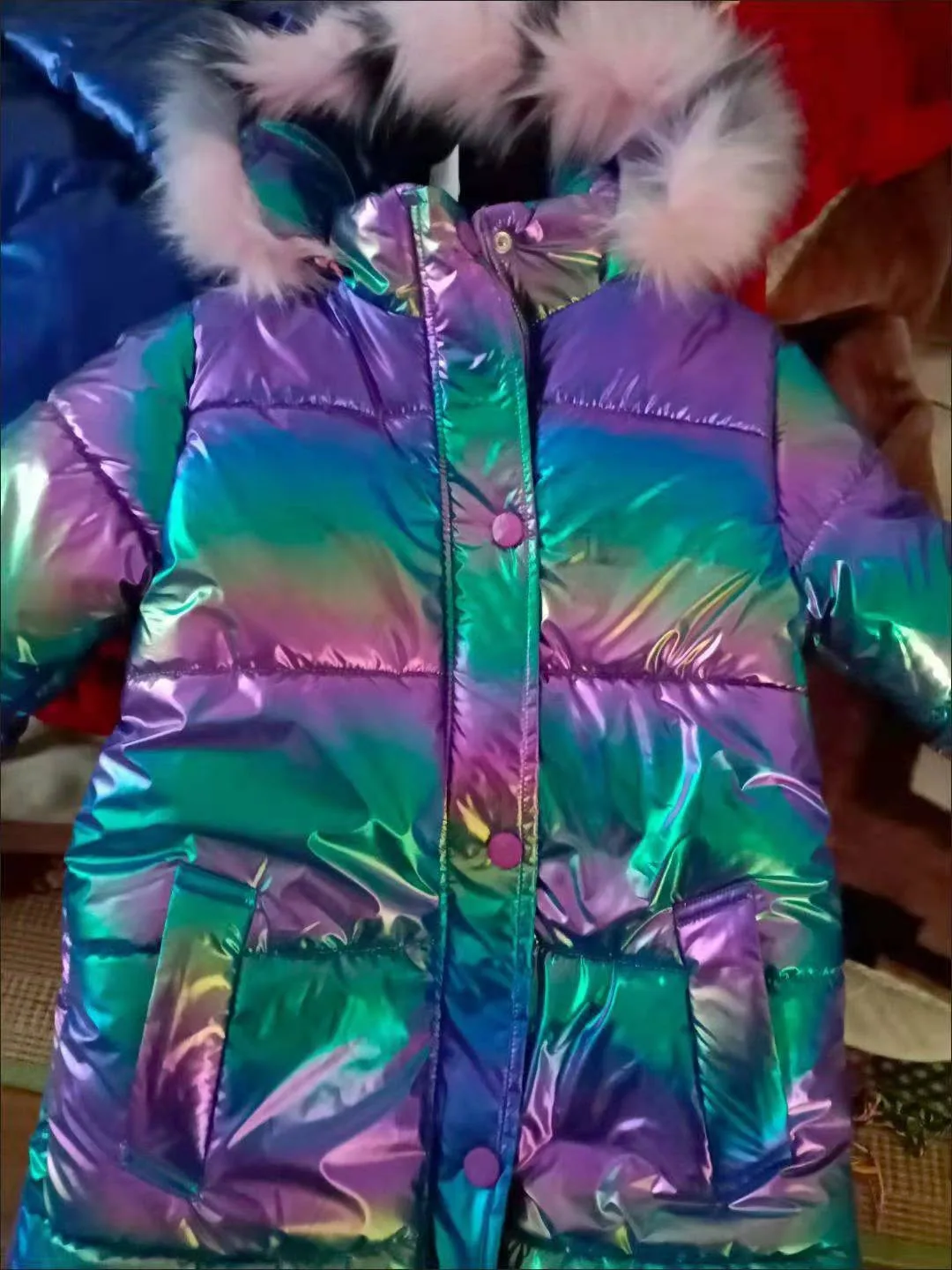 Модная блестящая детская хлопковая куртка для девочек, теплая Парка утепленная верхняя одежда с цветным меховым воротником зимняя одежда Зимний комбинезон для девочек 5-16 летКуртка для девочки