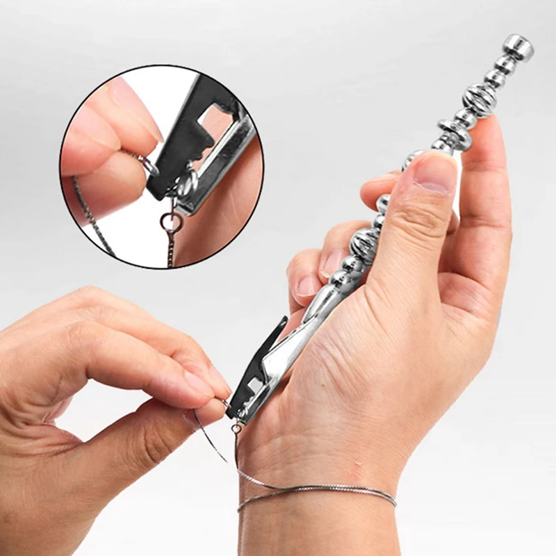 Используйте инструмент, чтобы зажать конец браслета. Удерживайте инструмент в той же руке, что и запястье, надев ювелирные изделия. Это также может быть хорошим инструментом для задней молнии, что облегчает застежку на ожерелье.