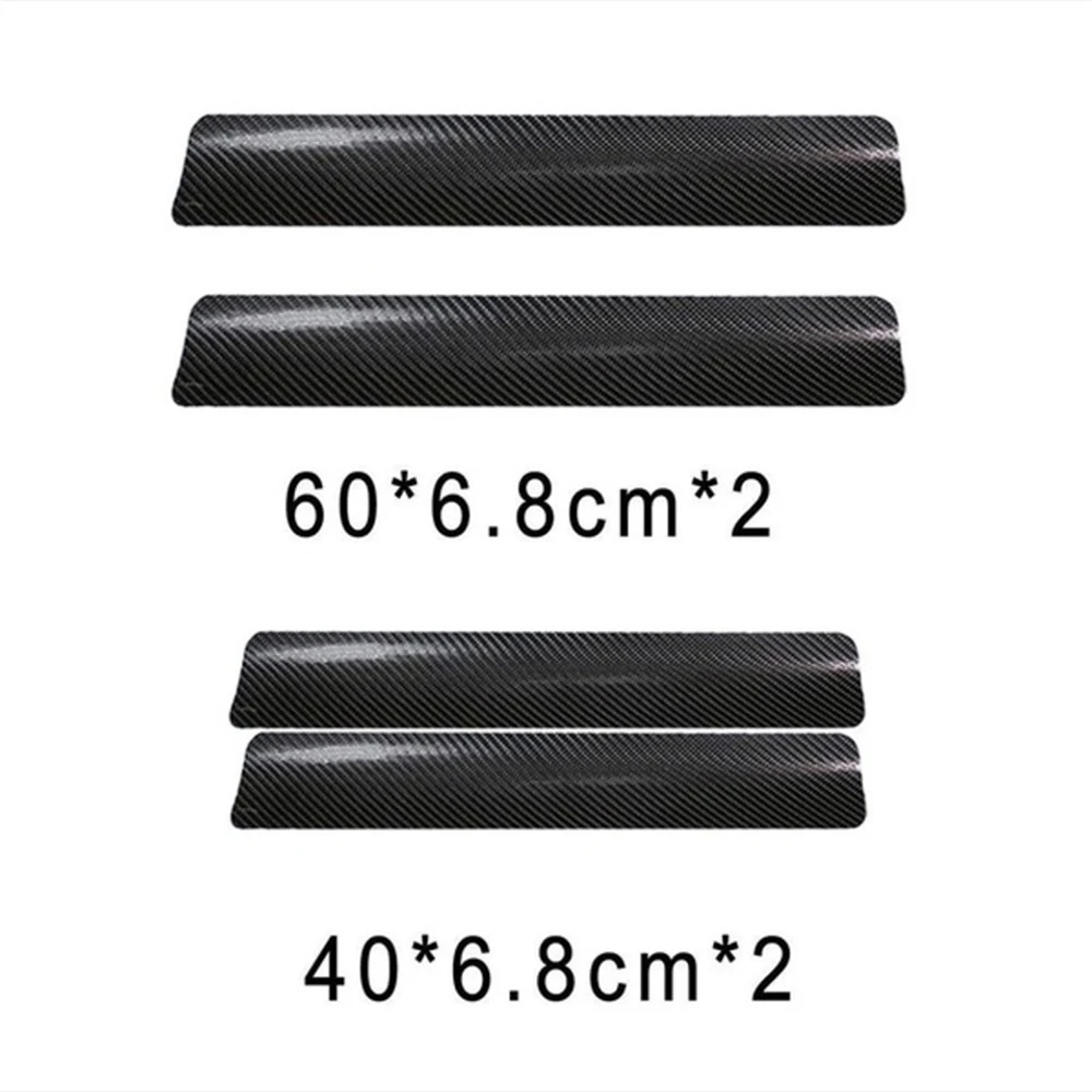 Защитная пленка для защиты порогов авто, имитация под карбон, набор из 4 штук. 2 пленки размером 60 х 6.8 см и 2 пленки размером 40 х 6.8 см. Наклеивать пленку стоит на чистую, обезжиренную поверхность.