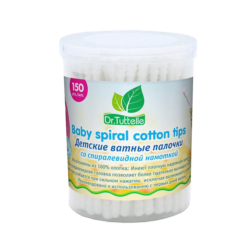 Детские ватные палочки со спиралевидной намоткой в пластиковом боксе 150 шт., изготовлены из 100% хлопка. (имеют тонкий, но упругий бумажный стик). Для ухода за ушами, носом, пупком малыша, а так же для удаления излишней влаги в складках кожи и между пальцами. Так же подходит для снятия макияжа. Состав: 100% хлопок, бумажный стик, упаковка- пластик-бумага