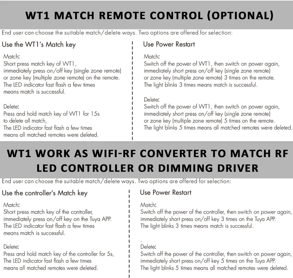 ● Each WT1 controller can also work as WiFi-RF converter, then use Tuya Smart Life APP to control one or more RF LED controller