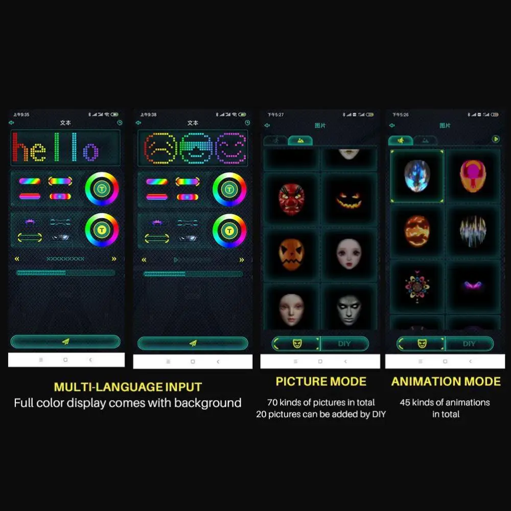 1. Светодиодный светильник, изменяющий лицо, излучающий лицо покрытие: полноцветный дисплей лицевой крышки принимает уникальный дизайн и имеет четыре режима отображения: редактирования текста, граффити DIY, анимация узора и музыкальный ритм. Вы можете подключиться к телефону с мигающим светодиодный экраном через приложение Bluetooth, а затем выделиться на любые вечерние мероприятия или праздники.