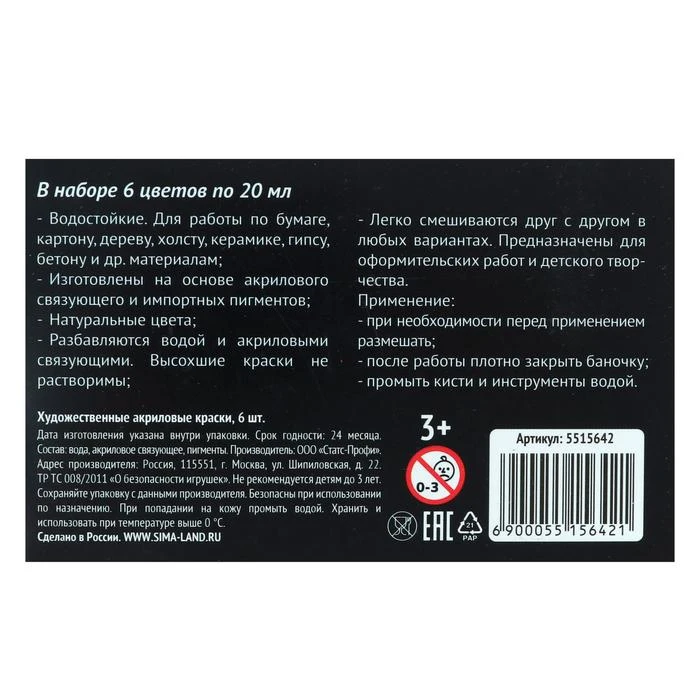 Set (yes/no) Yes Volume, m-l 20 Temperature limit transport Yes Euro suspension (yes/no) No Type of art. For hobbies and decoration, for children's creativity Number of colors 6 Color Mix Features of color Fluorescent Kind of packing Carton Box, plastic jar