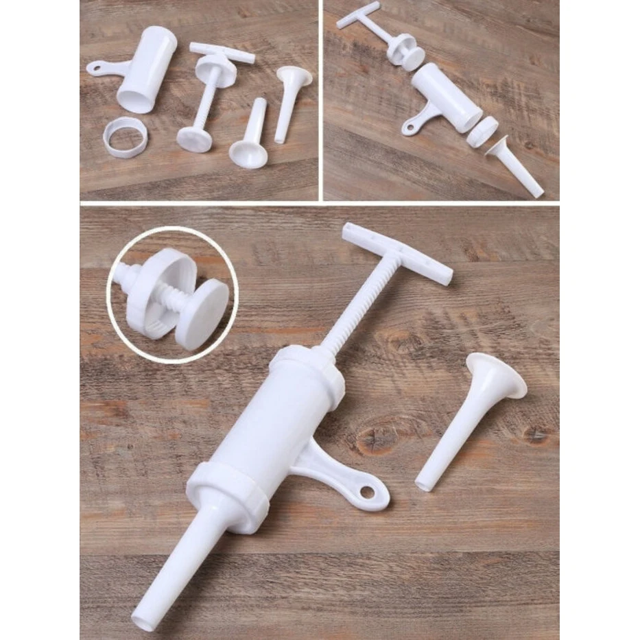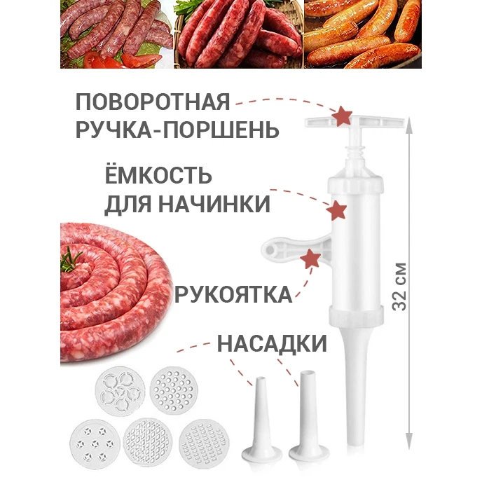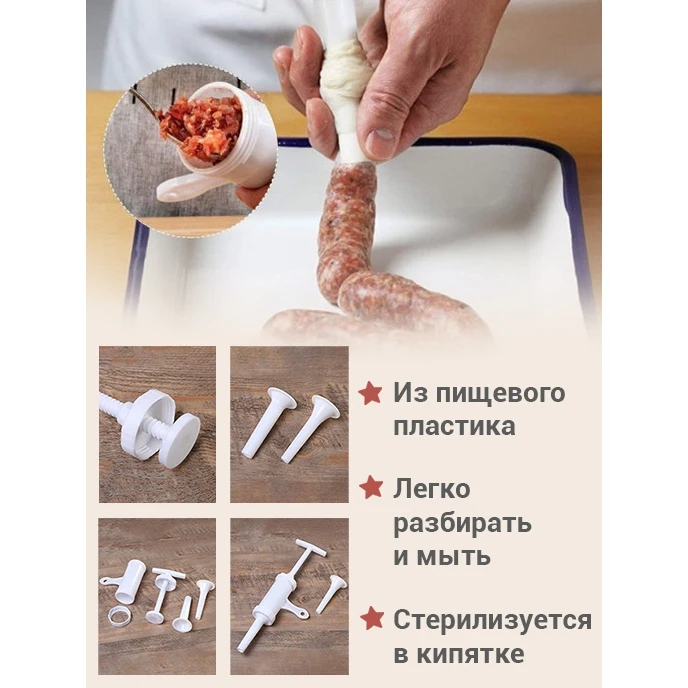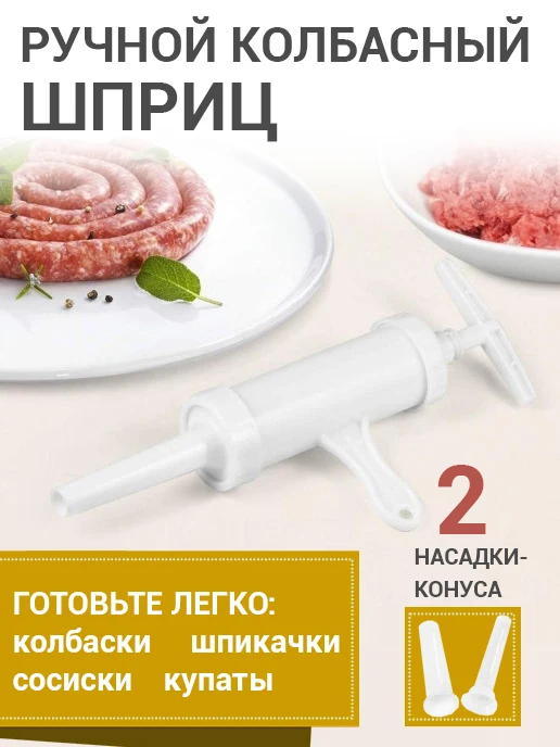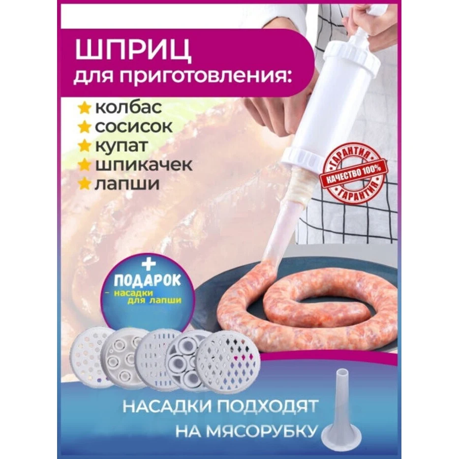Шприц колбасный для приготовления колбас, сосисок, купат, лапши. Какие преимущества:- Выполнен из высококачественного пластика.- В набор входят 7 насадок- Колбаски получаются плотные и не разваливаются.- Есть отверстия для выпуска воздуха. Фарш не вылезет наружу.- Легко разбирается и моется.- Не занимает много места.- Подходит для детского и диетического питания и для всех, кто хочет знать, что он ест.- Благодаря насадкам можно делать колбасы, сосиски, купаты и даже лапшу. Этот шприц - достойный помощник в набивке колбасок-гриль, купат, колбасок для жарки, в приготовлении лапши Вам тоже не будет равных! Также возможно набить некоторые виды тяжелых фаршей сыровяленых колбас. Кулинарный шприц станет полезным аксессуаром среди кухонной утвари.