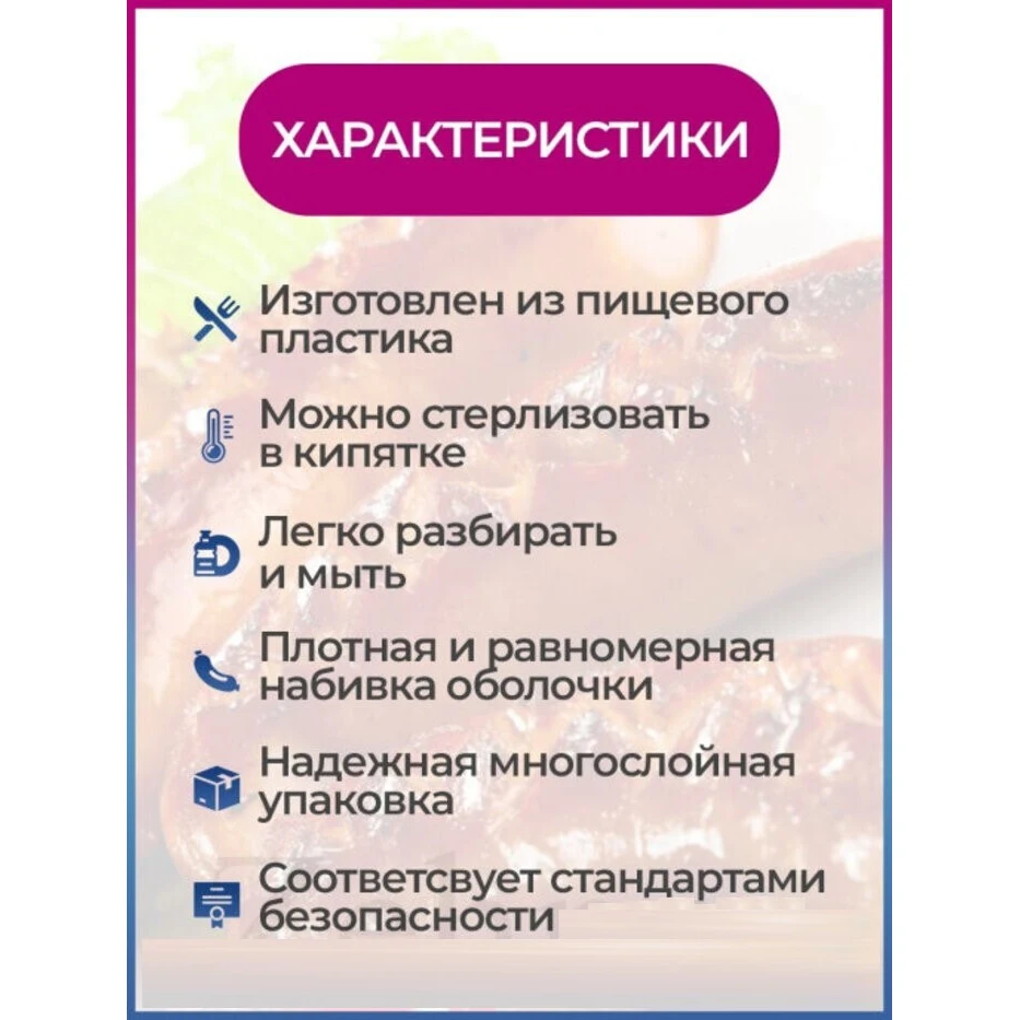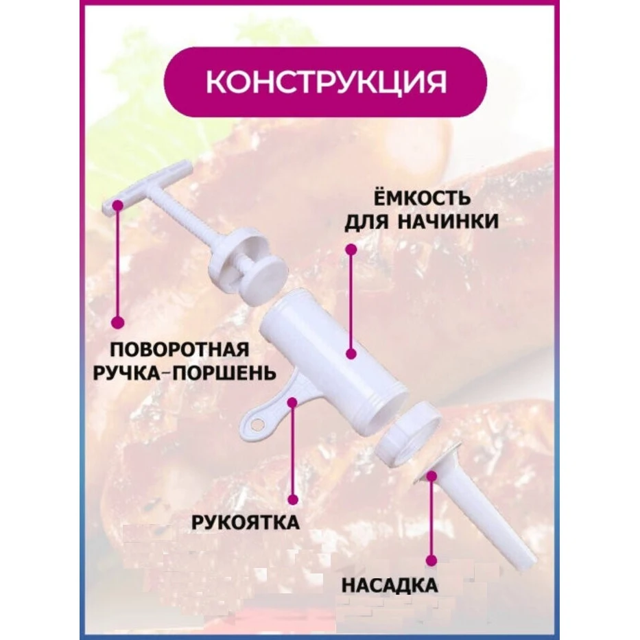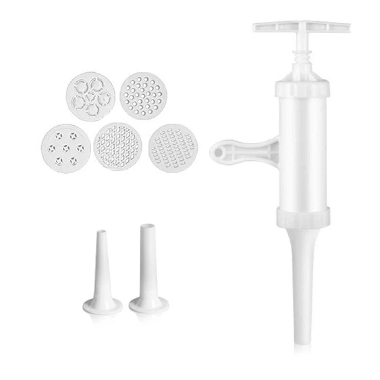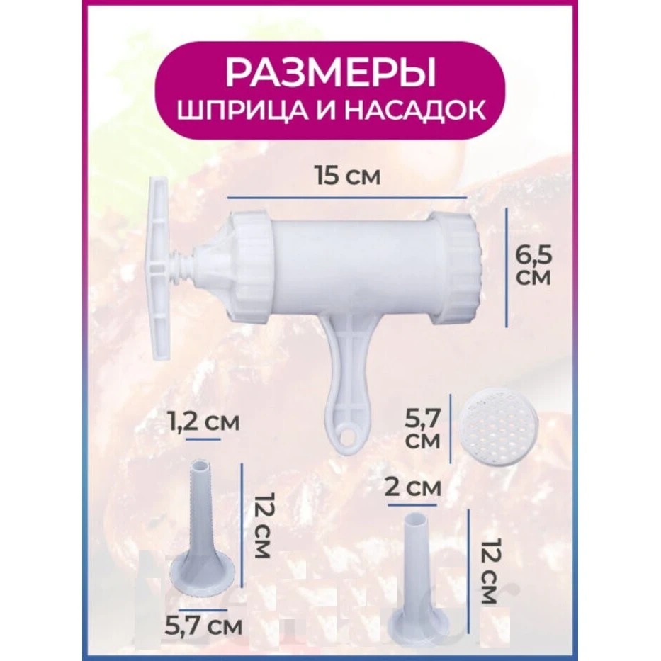 Шприц колбасный для приготовления колбас, сосисок, купат, лапши. Какие преимущества:- Выполнен из высококачественного пластика.- В набор входят 7 насадок- Колбаски получаются плотные и не разваливаются.- Есть отверстия для выпуска воздуха. Фарш не вылезет наружу.- Легко разбирается и моется.- Не занимает много места.- Подходит для детского и диетического питания и для всех, кто хочет знать, что он ест.- Благодаря насадкам можно делать колбасы, сосиски, купаты и даже лапшу. Этот шприц - достойный помощник в набивке колбасок-гриль, купат, колбасок для жарки, в приготовлении лапши Вам тоже не будет равных! Также возможно набить некоторые виды тяжелых фаршей сыровяленых колбас. Кулинарный шприц станет полезным аксессуаром среди кухонной утвари.