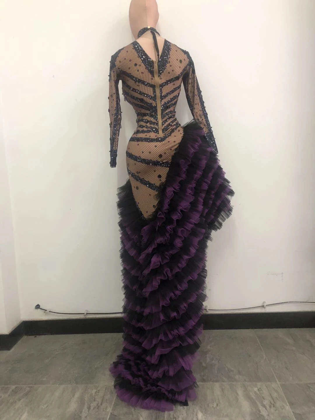 Клубное шоу певица Хрустальное Сетчатое Многоярусное фиолетовое платье стразы вечерние длинные платья Gogo костюмы для латинских танцев для сцены