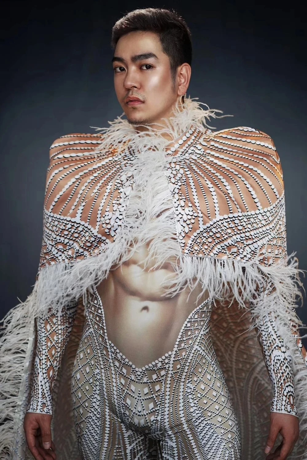 Зимний комбинезон с изображением перьев для мужчин и женщин, длинный плащ для певицы, для сцены, танцев, стрейч, боди, вечерние костюмы для сцены