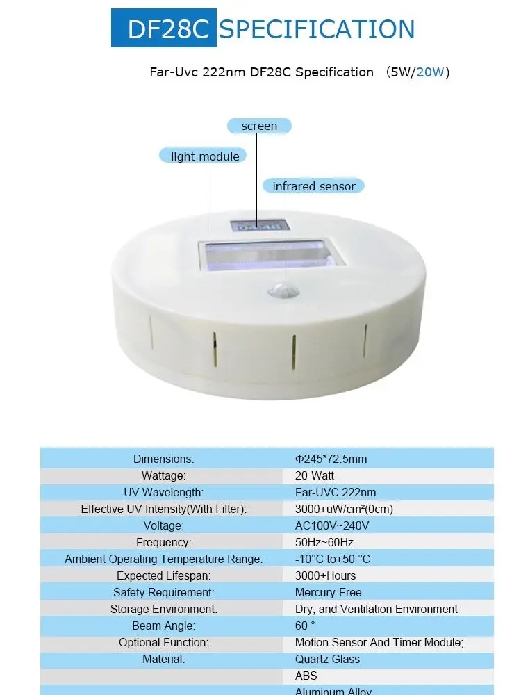 Дезинфекция серии QNICE 222nm FAR-UVC DFИнновация FAR-UVC, QNICE 222nm DF-серия приложений-это новый щит в борьбе с супер вирусом. DF-серия новаяИнструмент, который эффективно и безопасно деактивирует воздушно-десантные вирусы.Специальное издание-20 Вт-222нм Far Uvc Excimer светильник
