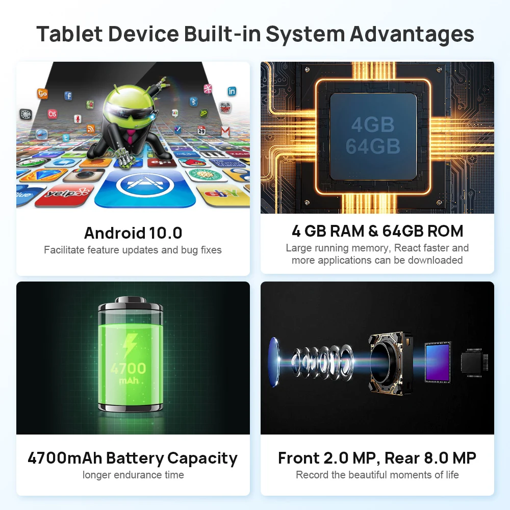 6.【 громких планшет device】It использует большой 10,1 дюймовый планшет с аккумулятором емкостью 47000. Большая оперативная память 8 ядер CPU 46 ГБ DDR3 и память 64 Гб EMMC. Версия Android 10,0, вставьте sm-карту телефона можно использовать в качестве телефона связи.