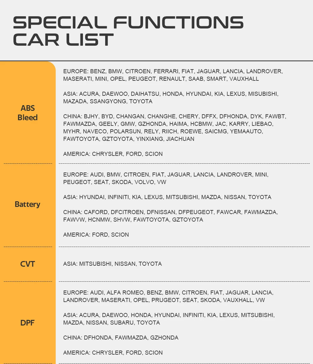 (2) 17 специальных функций (сервис сброса масла, сервис EPB, ABS кровотечение, BMS сервис, TPMS сервис, DPF сервис, IMMO сервис, SAS рулевой угловой датчик, инжекторное кодирование, TPS адаптация дроссельной заслонки, CVT, зубчатая передача, ODO-METER, регулировка пневматической подвески, регулировка высоты фары, регулировка сиденья и регулировка окна)