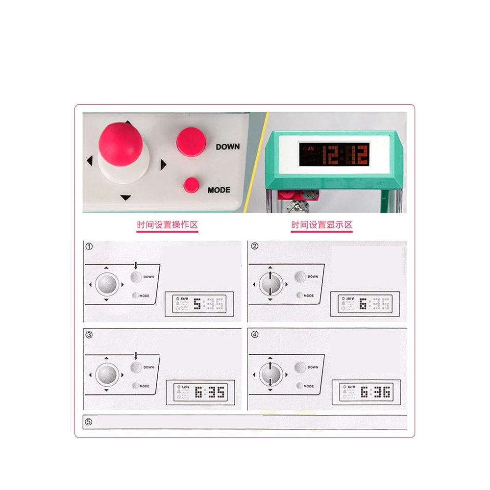 Примечания: когда будильник поднимается, вы должны поместить монету в слот для монет и перемещать джойстик вверх, вниз, влево и вправо, чтобы определить положение крючка захвата, нажмите кнопку вниз, чтобы получить подарок, и будильник прекратится. В противном случае он будет продолжать звонить. Вы должны принести свои собственные 3 батарейки AAA!