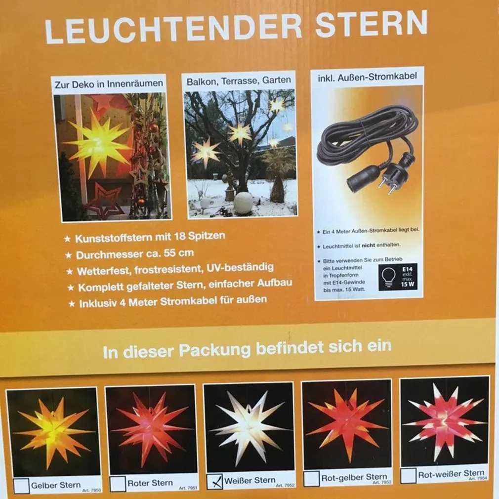 Особенности: 1. Светодиодный светильник: низкое напряжение, более энергосберегающий, более длительный срок службы. 2. Наружный водонепроницаемый дизайн: двусторонний патч, может использоваться обычно в дождливые дни. 3. Материал PP: 18 углов, красивая форма, мягкое ощущение осмотра, не вредит вашим глазам. Описание: 18 углов Красивая 3D светящаяся звезда подходит для использования в помещении и на открытом воздухе, она может создать романтическую атмосферу для окружающей среды. Характеристики: Тип: с европейской стандартной конверсионной лампой Материал: полипропилен Цвет: красный, белый (по желанию) Размер: 45 см Ремесло: ручная работа Функция: украшение Посылка включает в себя: 1X Звездный светильник