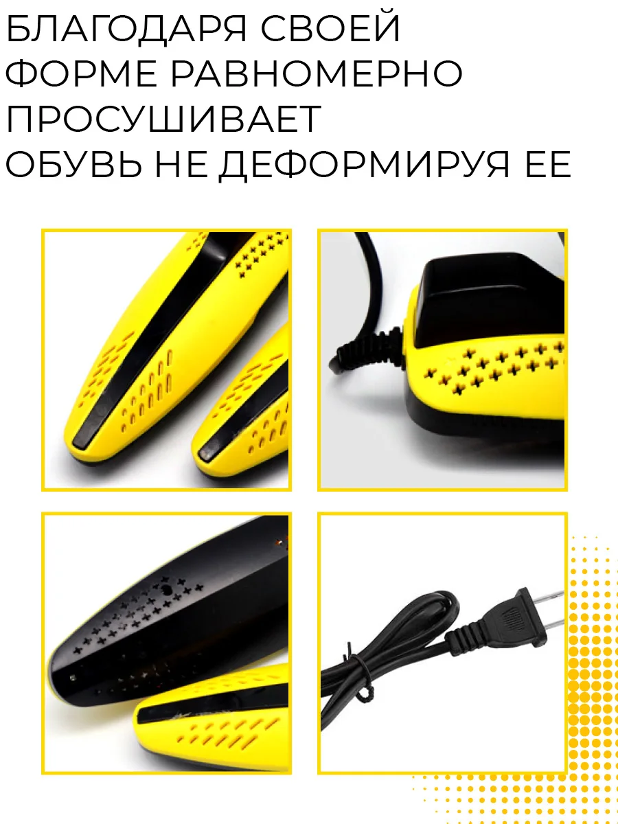 Electric shoe dryer is designed for drying shoes in household conditions by warming up the inner surface. Provides soft and uniform drying of shoes, allowing you to avoid cracking and deformation of the skin, preserving its appearance and protecting against premature aging. The electric shoe dryer is indispensable for drying children's, sports and specialized shoes, for example, ski boots, skates, and also dryers can be used for drying gloves. High electro-and fire safety is provided by double insulation of heating elements with non-flammable materials. Low power consumption and balanced temperature on the surface of heaters allows you not to limit the maximum drying time, regulating it only with the degree of drying of shoes. Yellow-black dryer is designed for adult shoes-working, home, sports, winter.