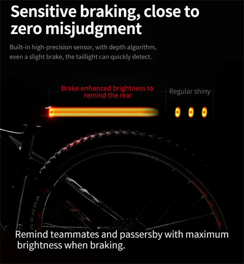 Функция: класс водонепроницаемости IP * 6, не боится грязи и мытья воды, не боится плохой погоды; Интеллектуальное Индукционное торможение, при обнаружении тормоза лампа светится в течение 5 секунд, входит в режим медленного мигания, выдерживает 10 секунд и автоматически выключается; Удобная Разборка и сборка, режим фиксации с резьбой; Поверхность облучения 180 ° для увеличения видимого диапазона