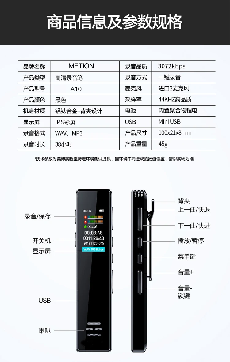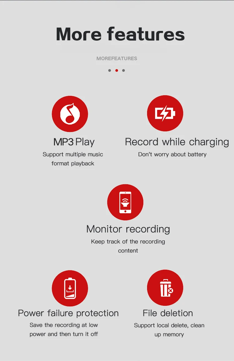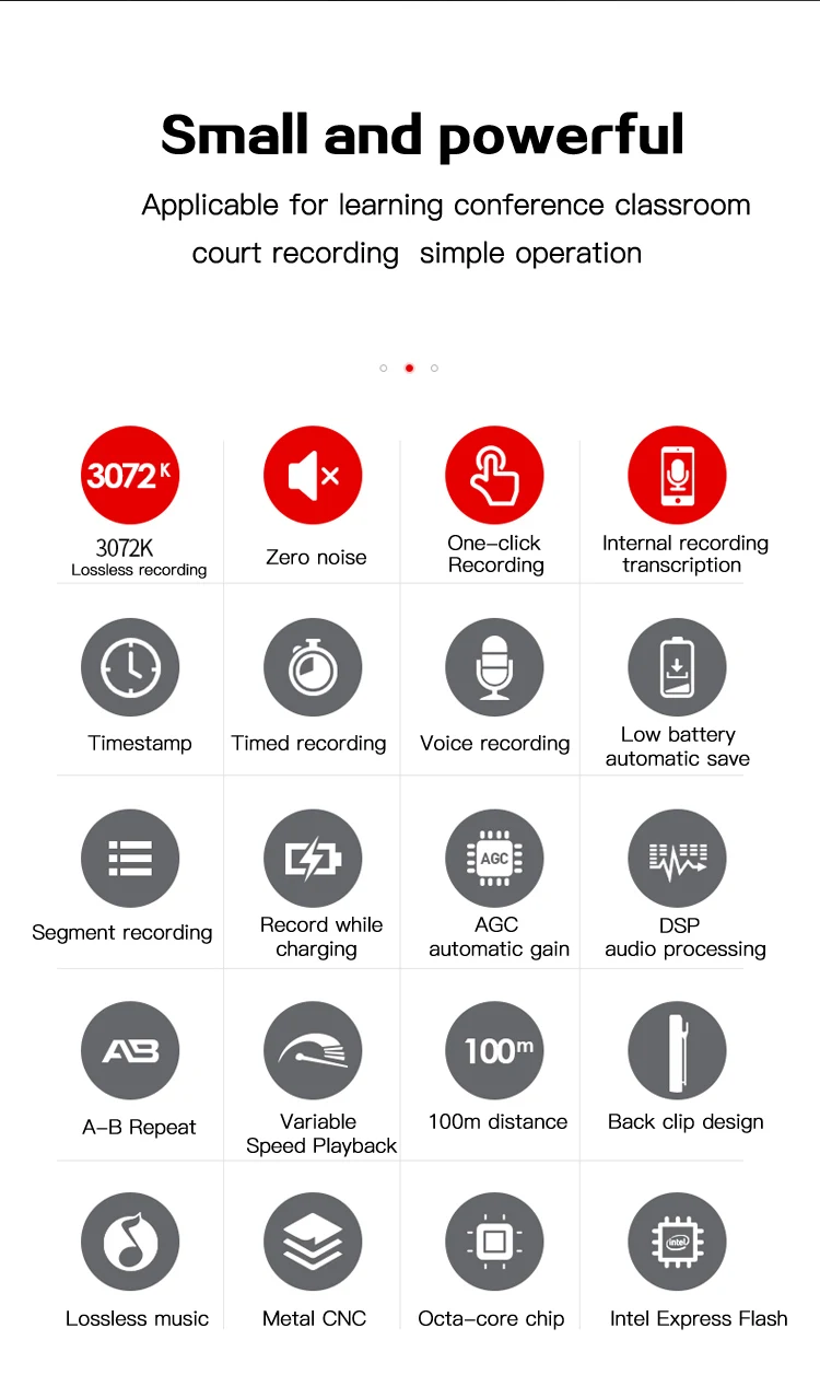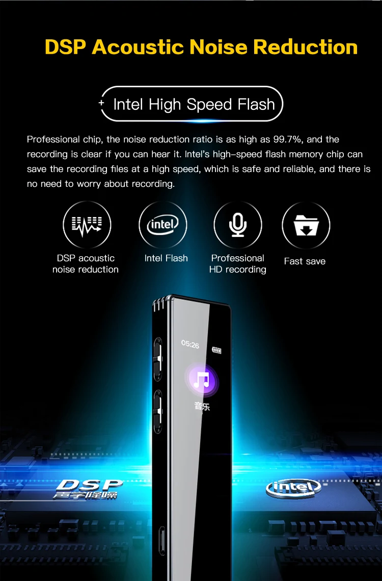 Принятие трех всенаправленных микрофона шумоподавления и технологии DSP шумоподавления, рекордер может продлить расстояние записи до 100 метров, обеспечивая звук с высоким разрешением 1536k.