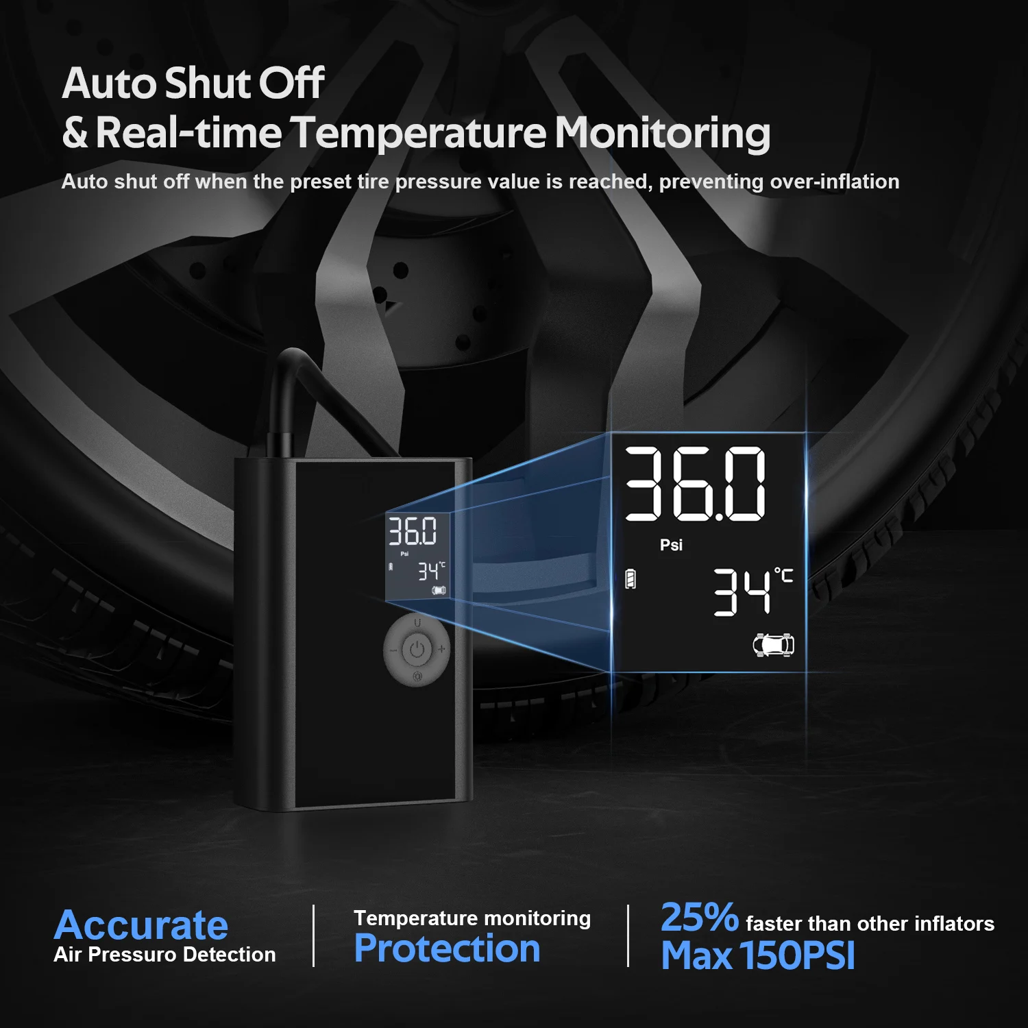 10. [мощный инфляционный эффект] надуть до 150 PSI обеспечивает 100 PSI Максимальное давление, может быстро надуть плоскую шину SUV в 5-8 минут от 0 до 7 бар