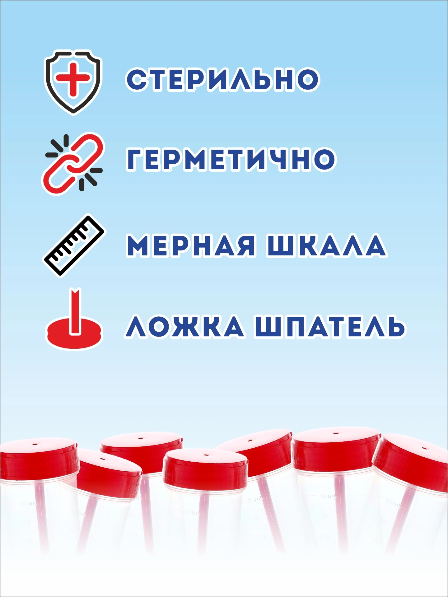 The container is designed to collect urine, sputum, mucus, tissue and other biological materials. The container is sterile in individual packaging, made of polypropylene, non-toxic and safe. On the body is a scale. The container is closed with a lid that provides complete leak during transportation: protects against leaking, splitting and inhalation contact.