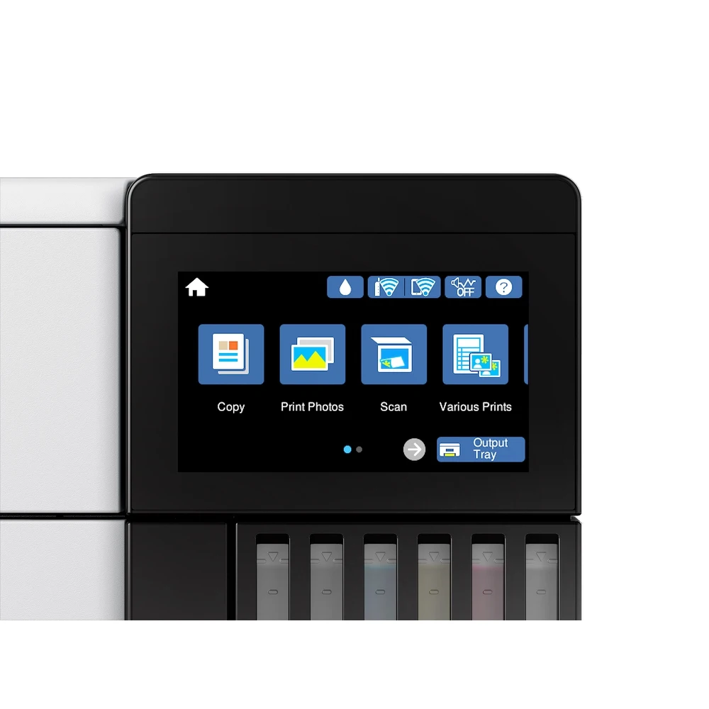 Фронтальные емкости для пополнения чернил вместо картриджей.