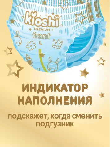 Премиум материалы не вызывают раздражение. Мягкий поясок обеспечивает удобную посадку, а боковые резиночки мягко облегают ножки и не стесняют движений. Индикатор наполнения подскажет, когда нужно поменять подгузник. Специальная лента для утилизации поможет убрать использованный подгузник. Новые трусики-подгузники KIOSHI PREMIUM подходят для мальчиков и девочек.