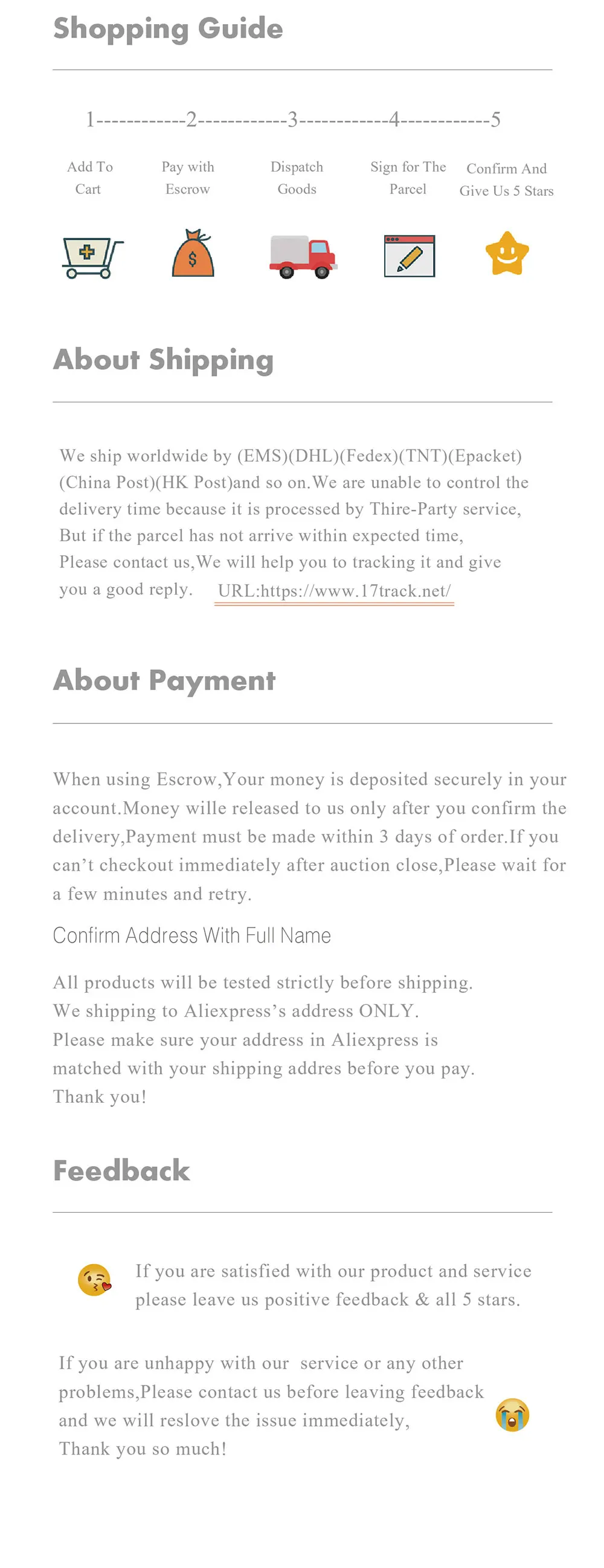 1. Please leave 5 star feedback if you're satisfied with our products and service, we would appreciate it (Item as Described 5 stars, Communication 5 stars, Shipping time 5-stars).