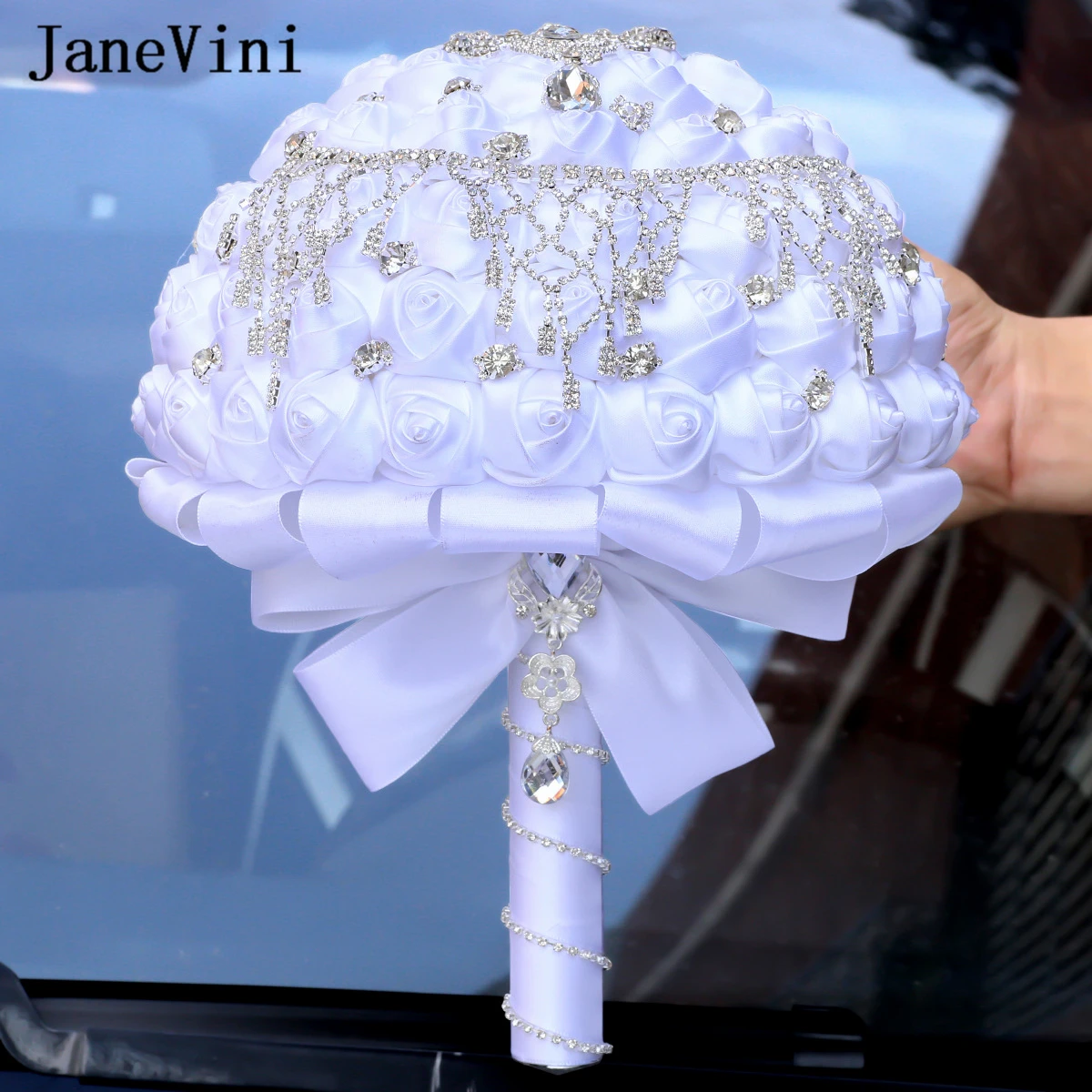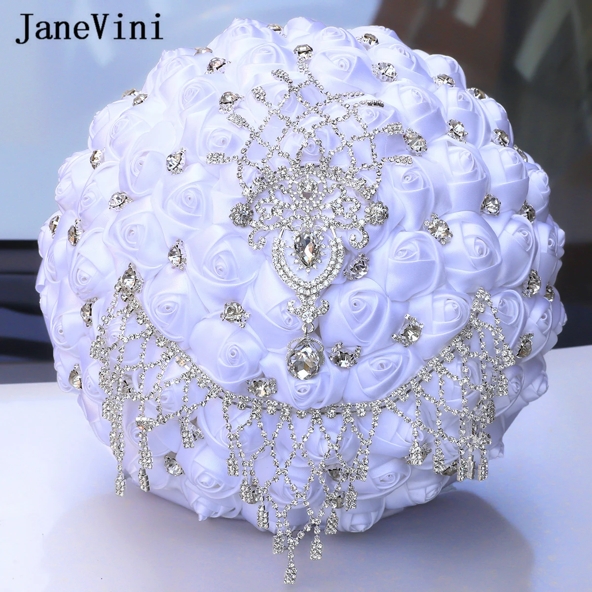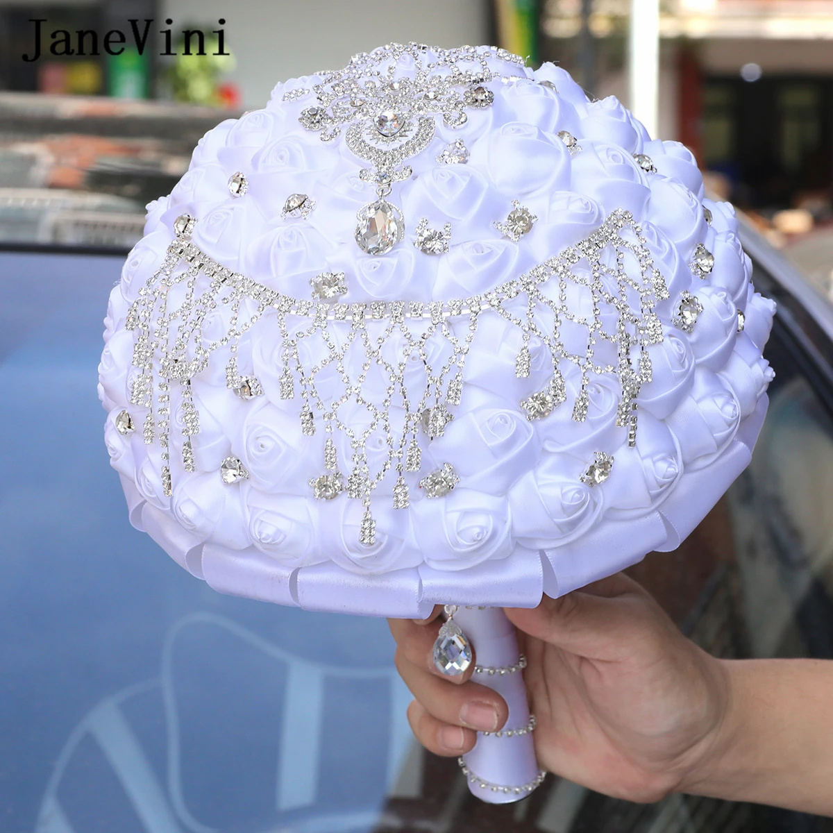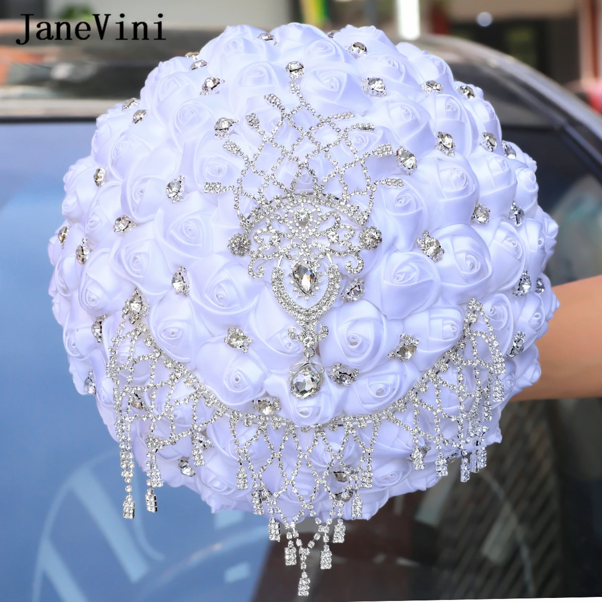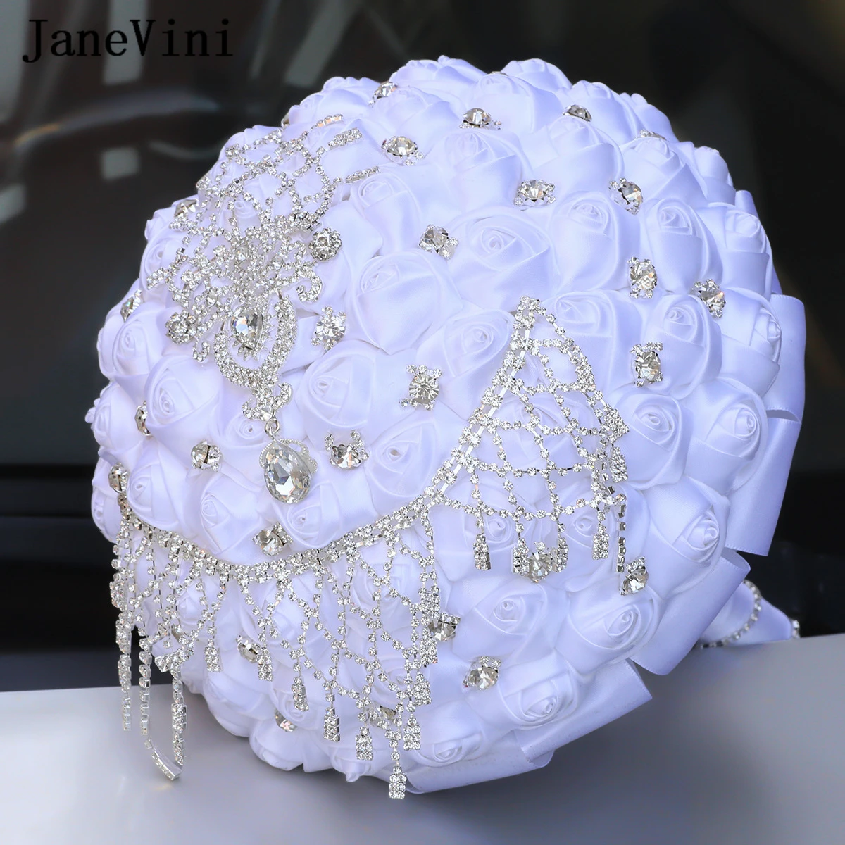 JaneVini Vintage Wedding Bridal Bouquets Luxury Crystal Artificial Satin Roses Brides Holding Flowers Beaded Sparkle Customized