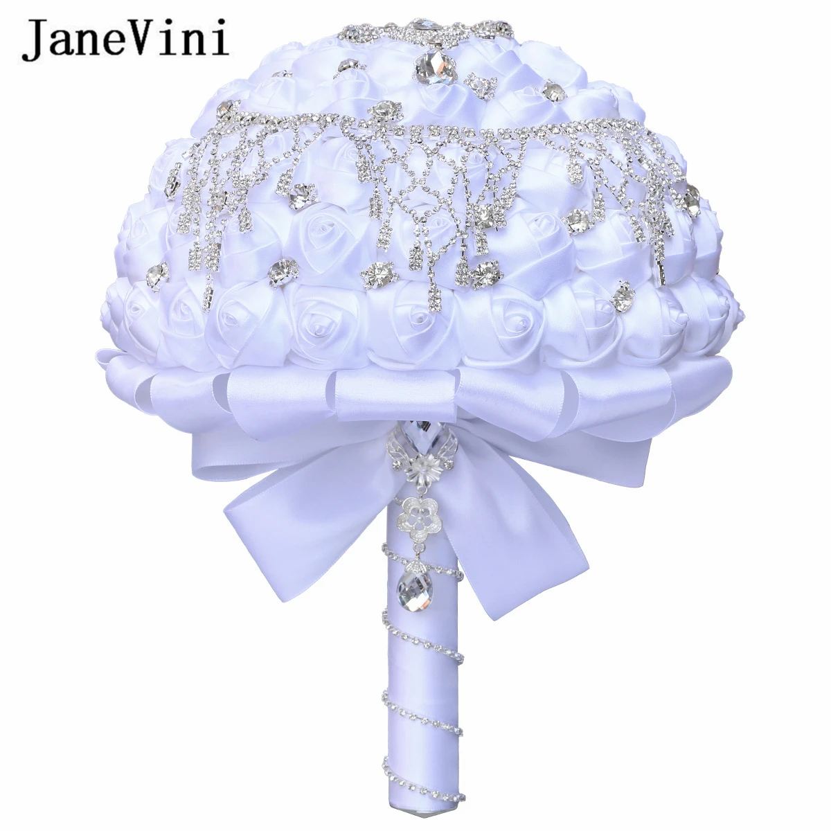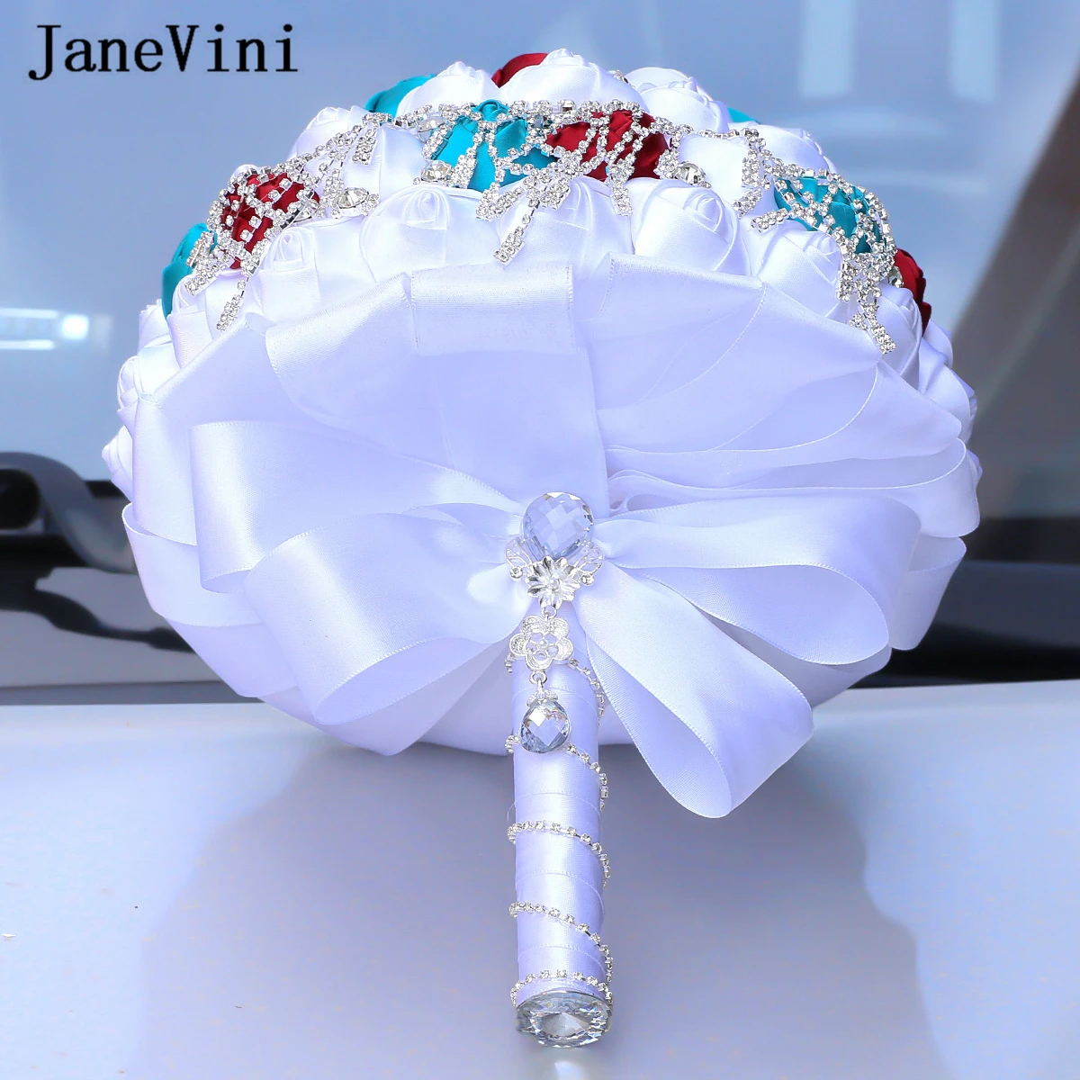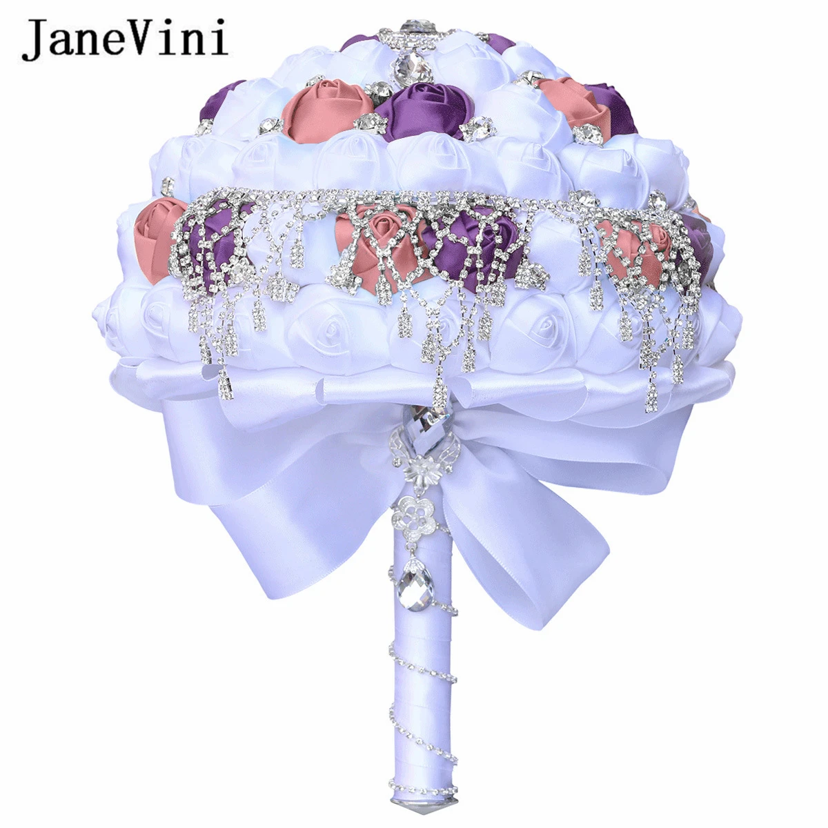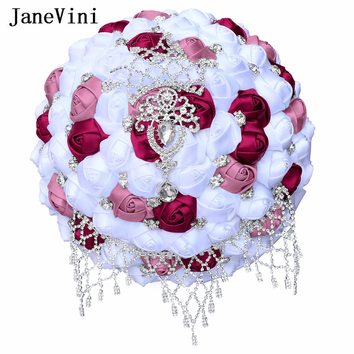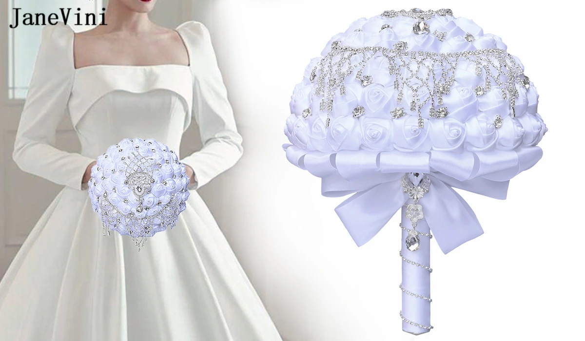 JaneVini Vintage Wedding Bridal Bouquets Luxury Crystal Artificial Satin Roses Brides Holding Flowers Beaded Sparkle Customized