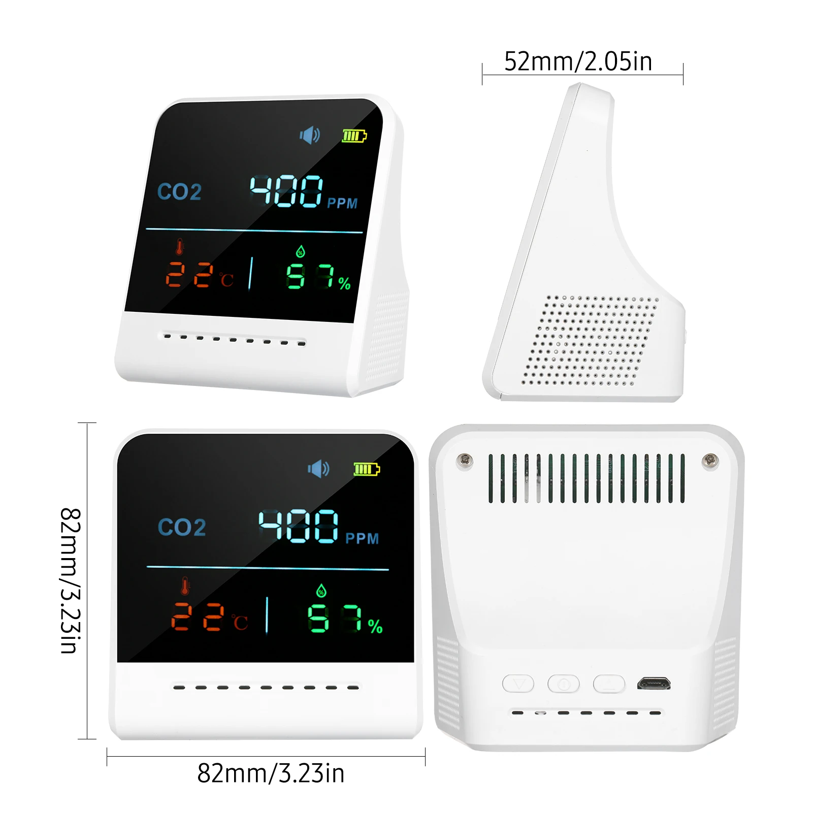 ЖК-экран: Отображает углекислый газ, уровень заряда батареи, температуру и влажность. С большим ЖК-экраном, четким для чтения даже в темной среде. С стабильной базой, легко помещается на рабочем столе.