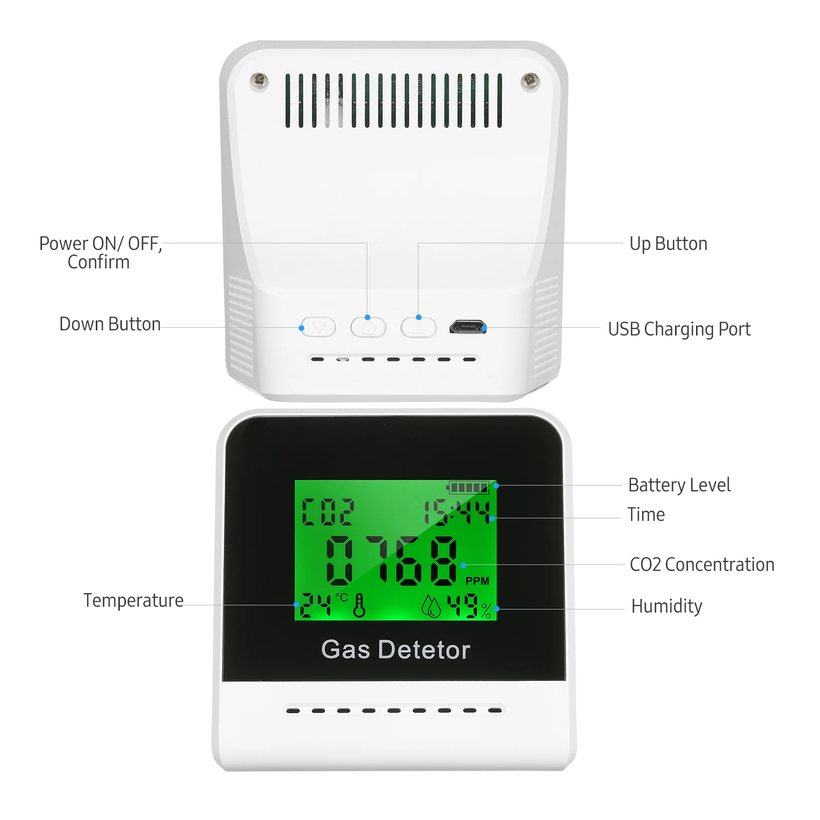 Детектор углекислого газа эффективно определяет концентрацию CO2 в окружающей среде, в которой вы живете. С ЖК-экраном, он отображает углекислый газ, уровень заряда батареи, температуру и влажность. С точным датчиком и функцией сигнализации, он может быть широко в доме, классе, гостиничном зале, квартире, офисе, тренажерном зале и многое другое!