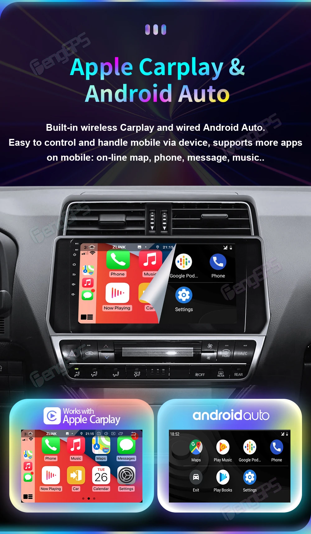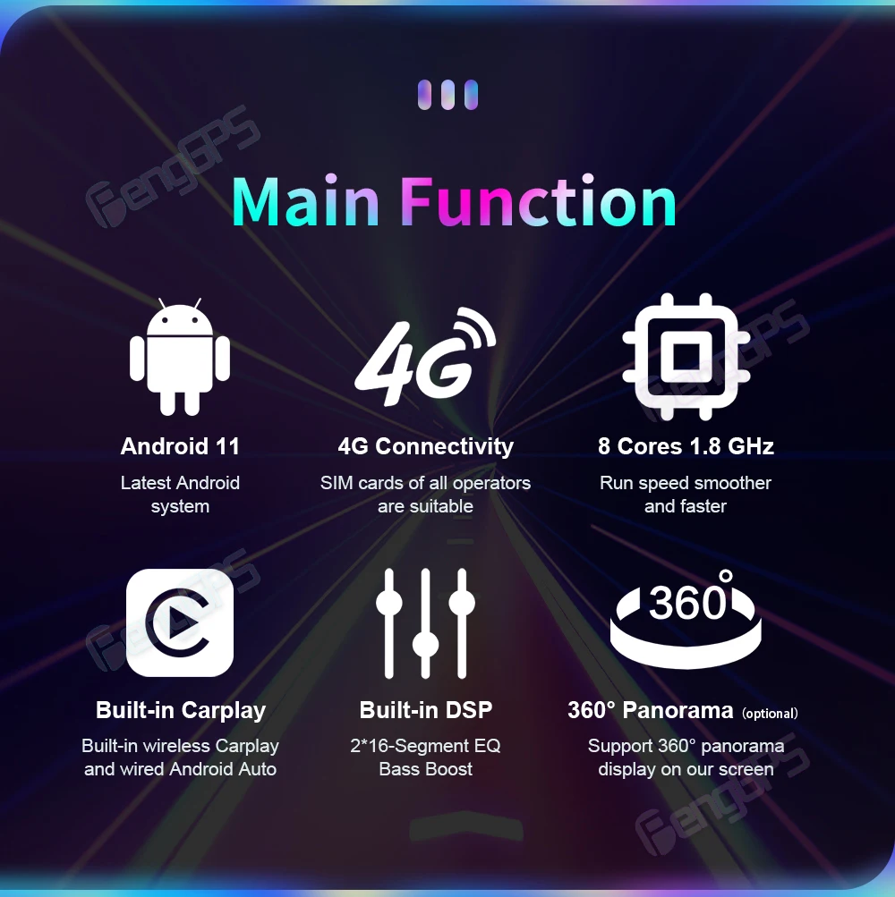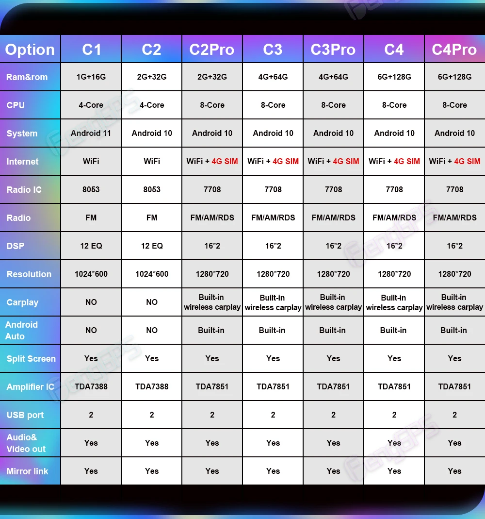 ♦. 4 + 32,8-core.DSP,4G SIM ,1280 * 720.AHD. 10,0, Carplay/Android Auto